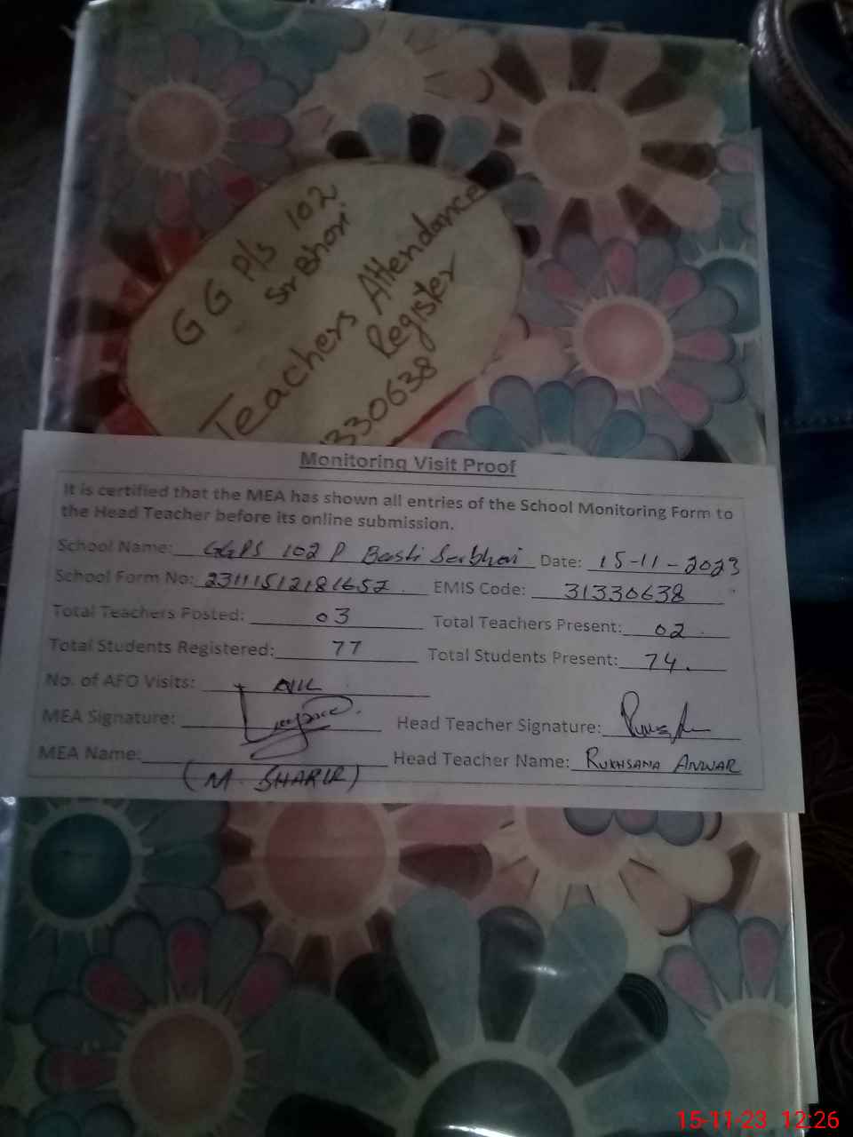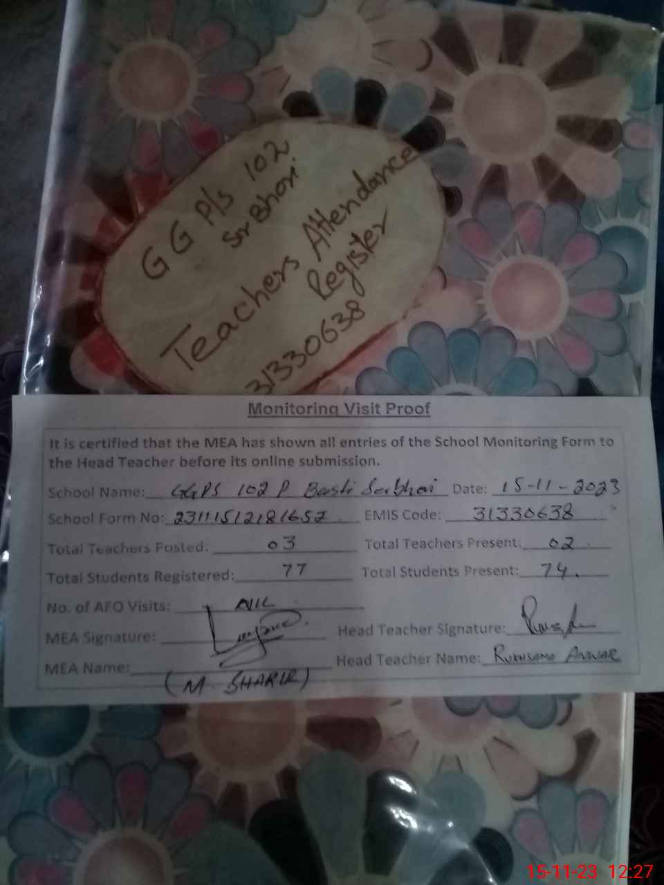 | Attendance Register | Head Teacher | MEA with School | Visit Proof |