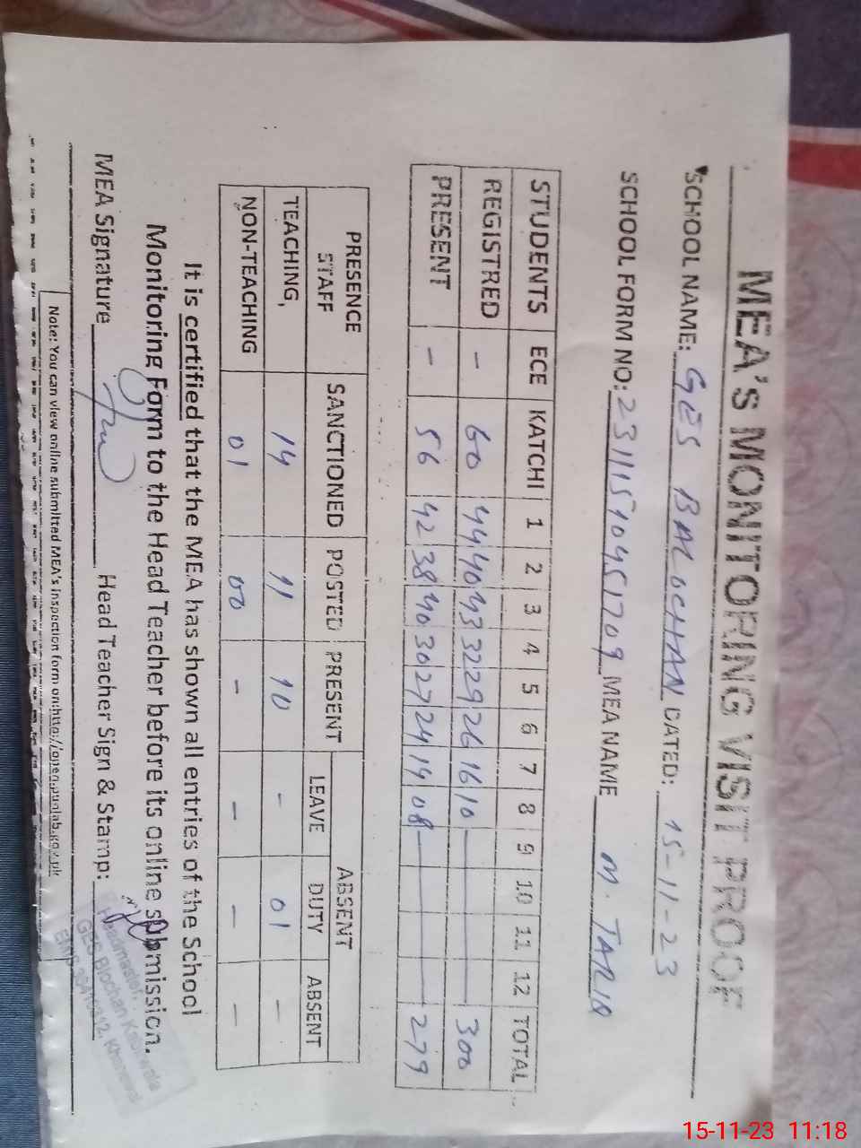 | Attendance Register | Head Teacher | MEA with School | Visit Proof |