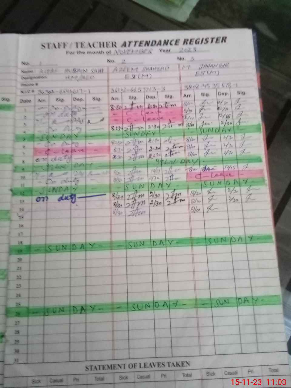 | CNIC | Full Name | Designation | R/C | Absence During Last Calender Month |