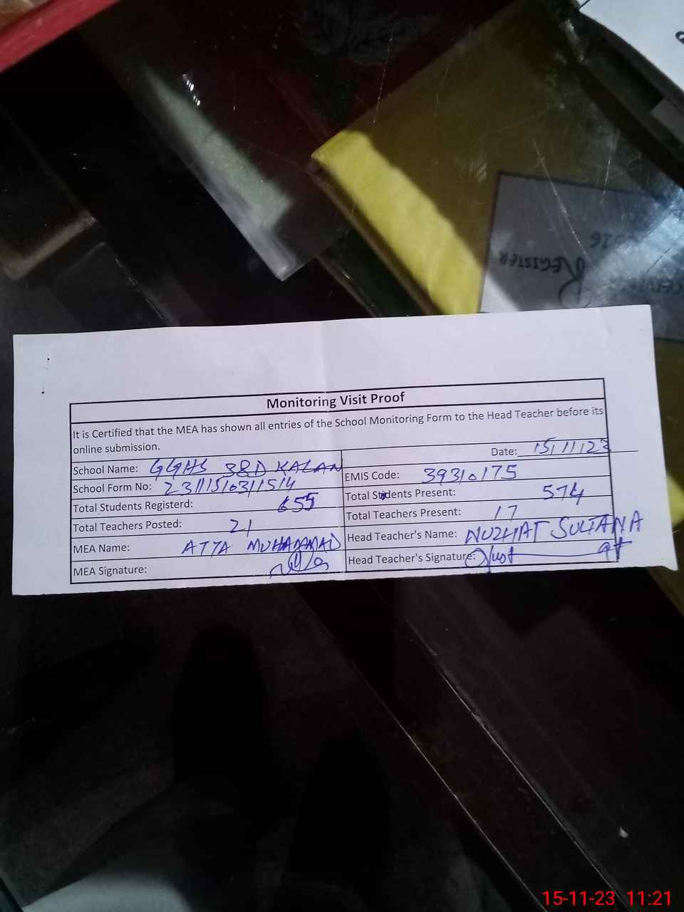 | Attendance Register | Head Teacher | MEA with School | Visit Proof |
