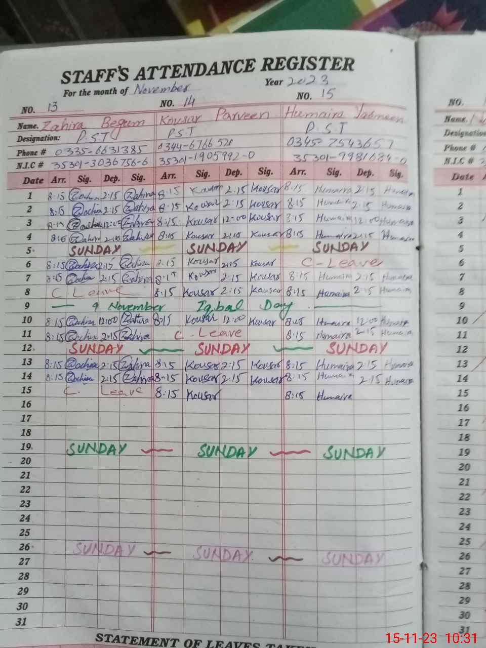 | CNIC | Full Name | Designation | R/C | Absence During Last Calender Month |