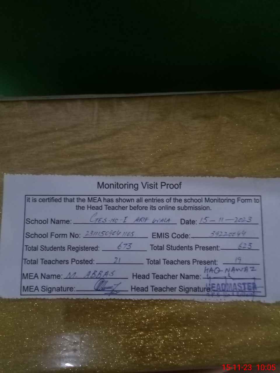 | EMIS Code: 39220044 | Name of School: GES NO. 1 ARIF WALA | |||