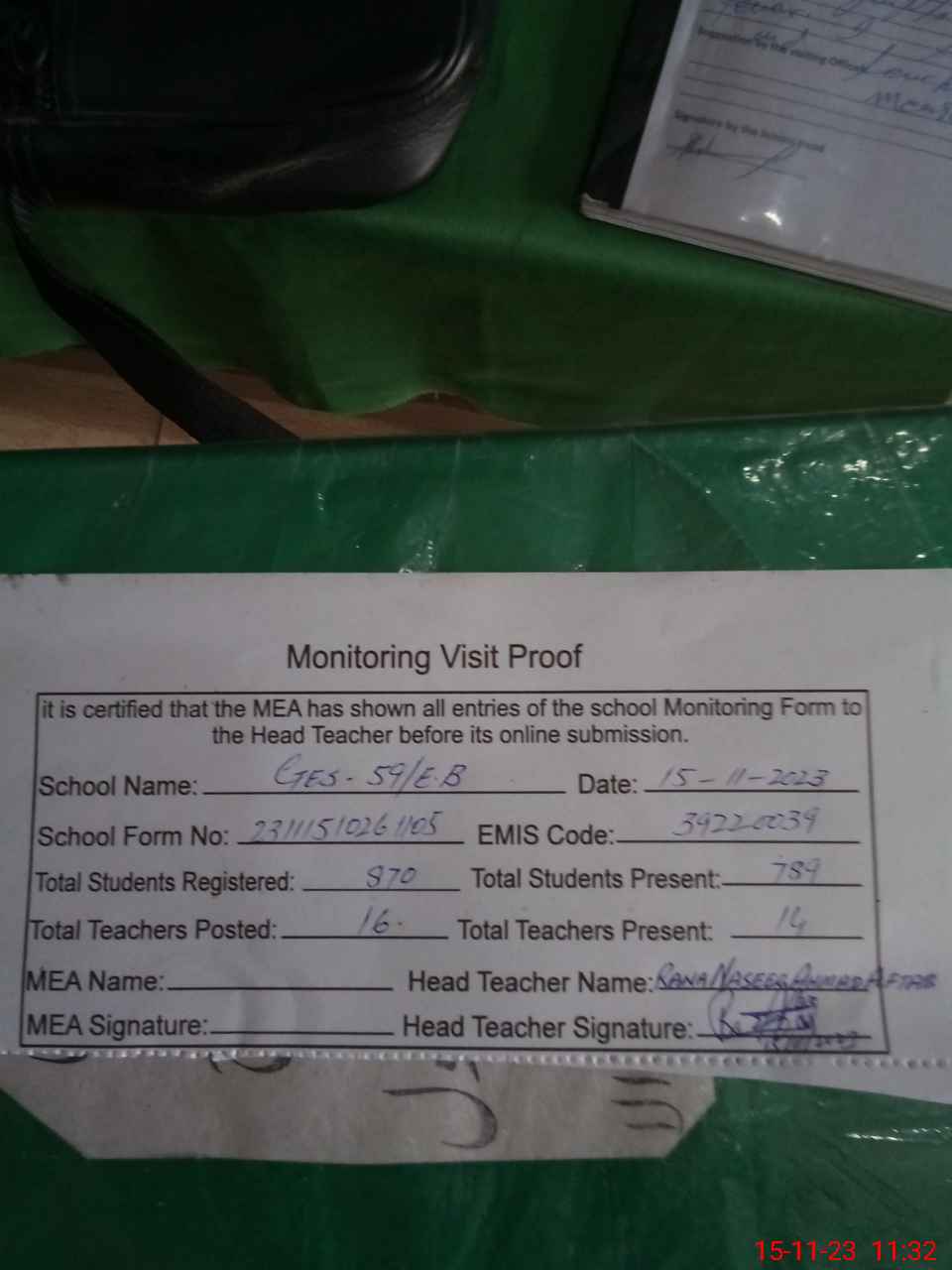 | Attendance Register | Head Teacher | MEA with School | Visit Proof |