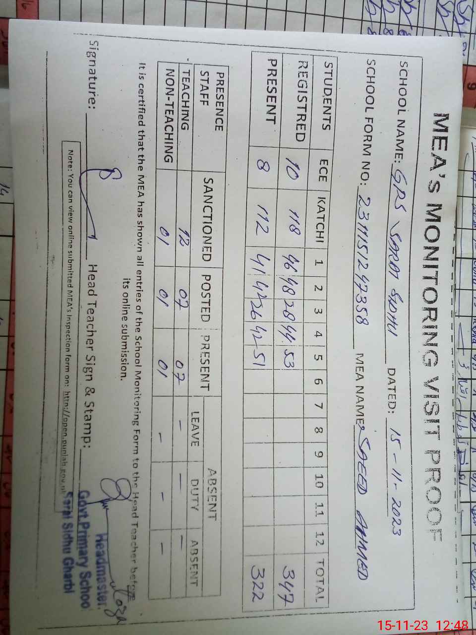 | Monitoring Date: 15-11-2023 | Start Time: 15-11-2023 12:30 PM | End Time: 15-11-2023 01:11 PM | Name of MEA: Sa**** Ah**** | |