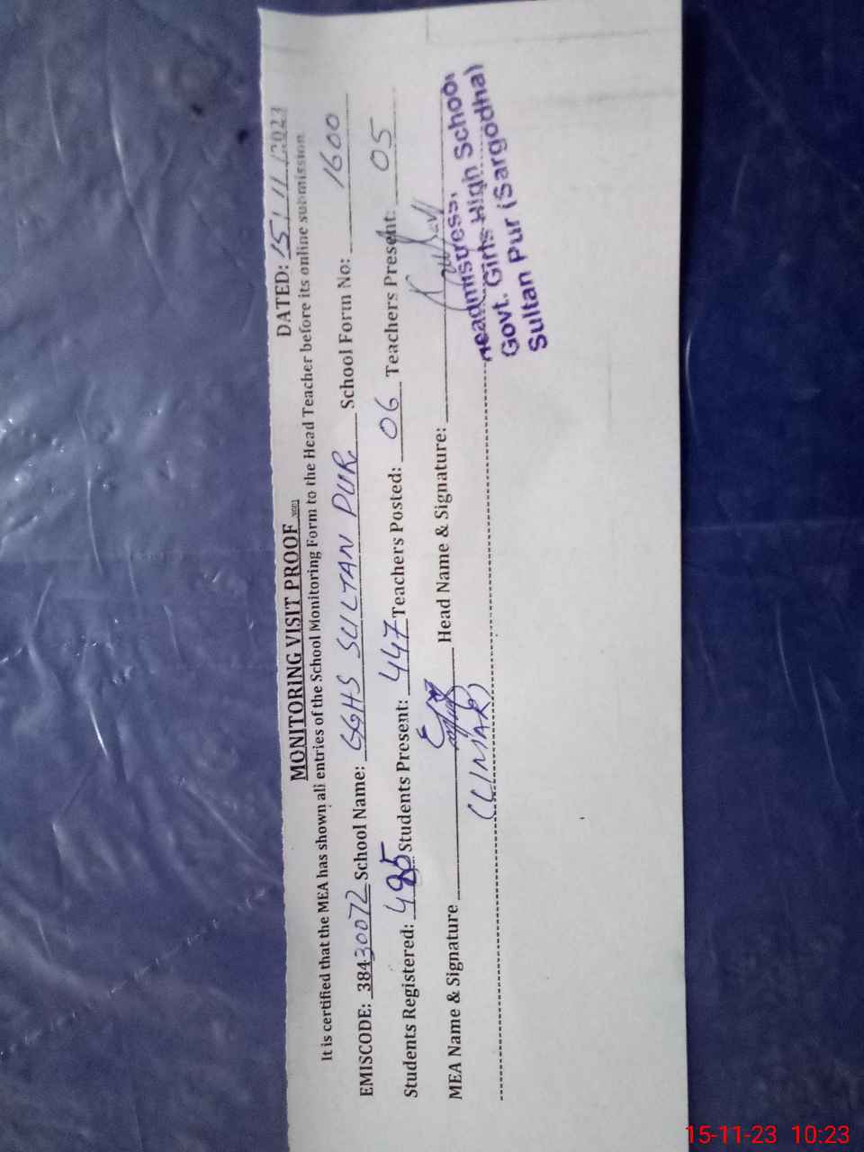 | EMIS Code: 38430072 | Name of School: GGHS SULTAN PUR | |||
