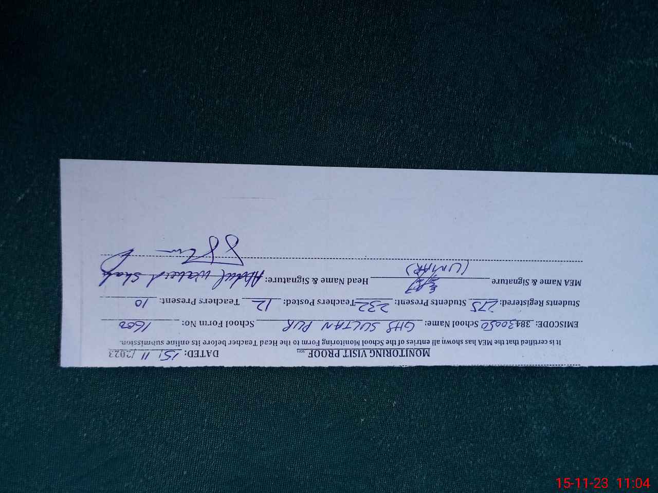 | Monitoring Date: 15-11-2023 | Start Time: 15-11-2023 10:25 AM | End Time: 15-11-2023 11:07 AM | Name of MEA: UM**** DR**** | |