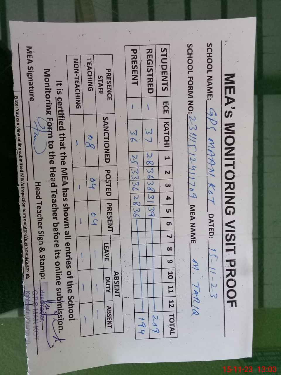 | Attendance Register | Head Teacher | MEA with School | Visit Proof |