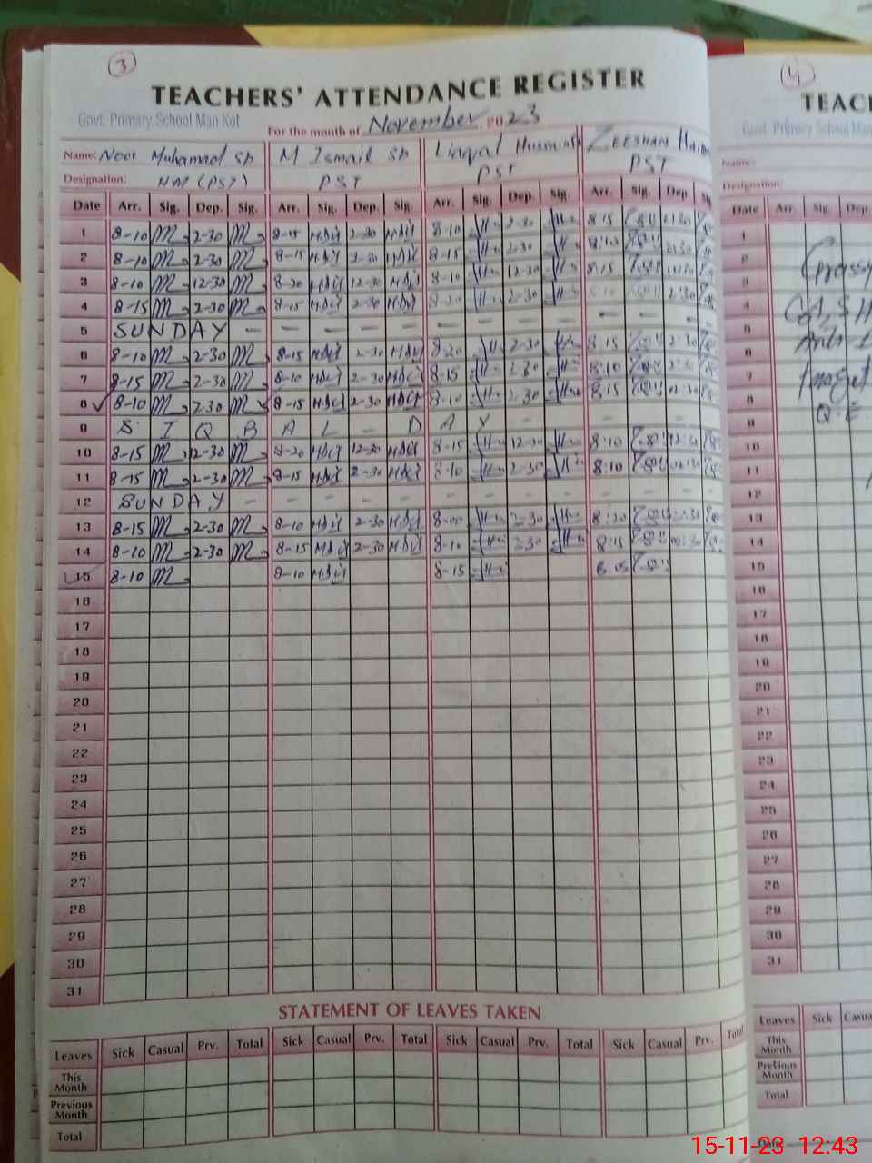 | CNIC | Full Name | Designation | R/C | Absence During Last Calender Month |