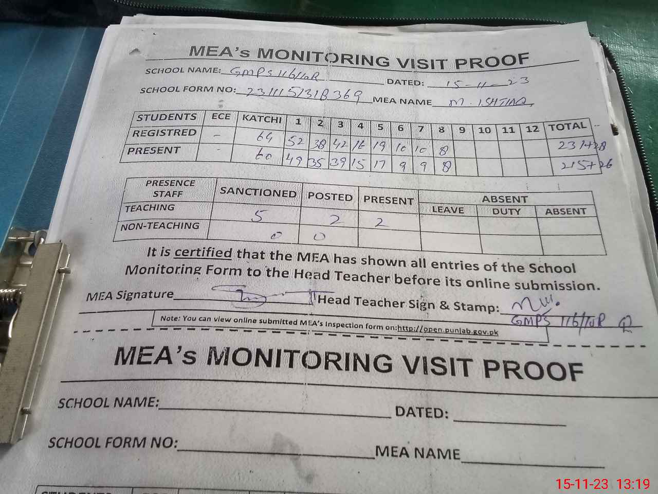 | Attendance Register | Head Teacher | MEA with School | Visit Proof |