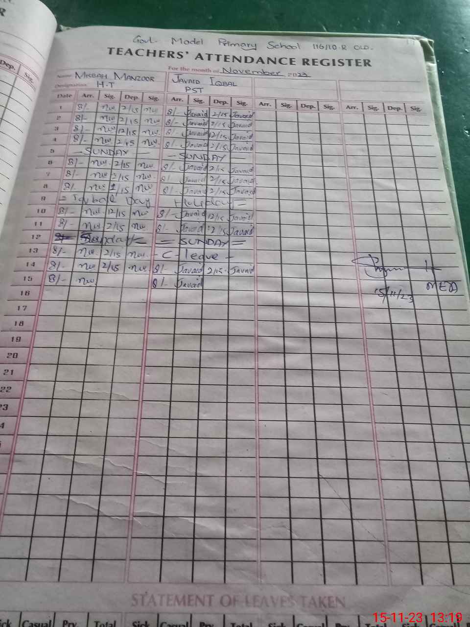 | Monitoring Date: 15-11-2023 | Start Time: 15-11-2023 12:40 PM | End Time: 15-11-2023 01:21 PM | Name of MEA: M.Is**** (S**** 03**** | |