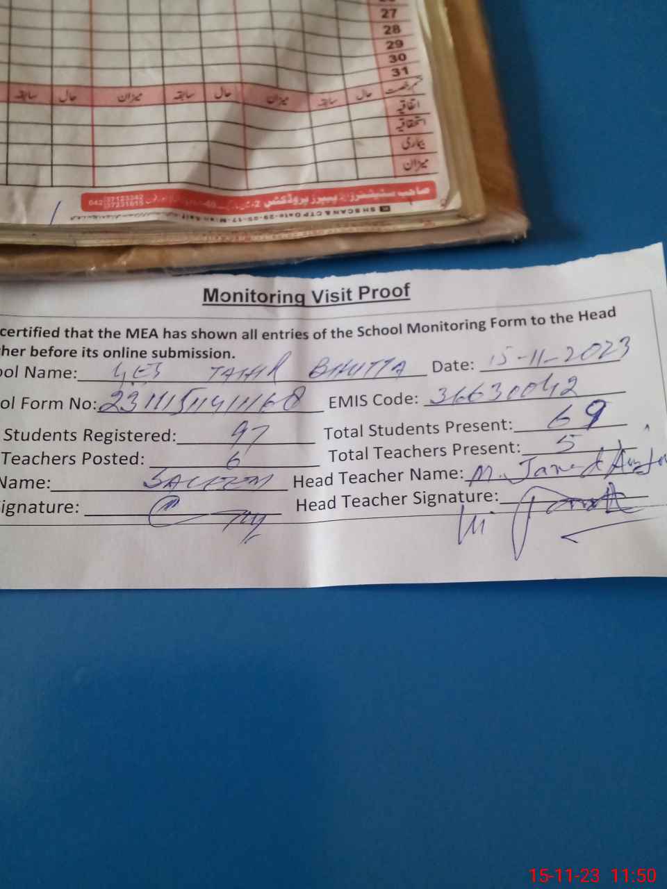 | Attendance Register | Head Teacher | MEA with School | Visit Proof |