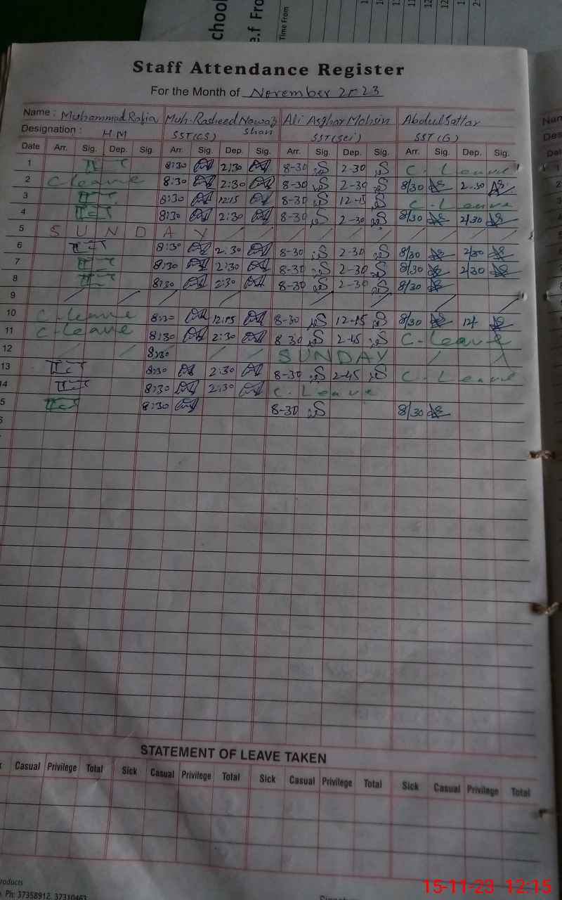 | CNIC | Full Name | Designation | R/C | Absence During Last Calender Month |