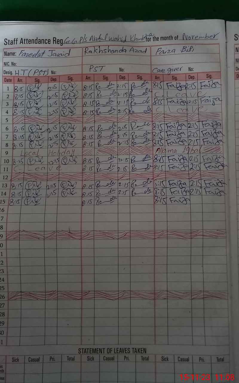 | CNIC | Full Name | Designation | R/C | Absence During Last Calender Month |