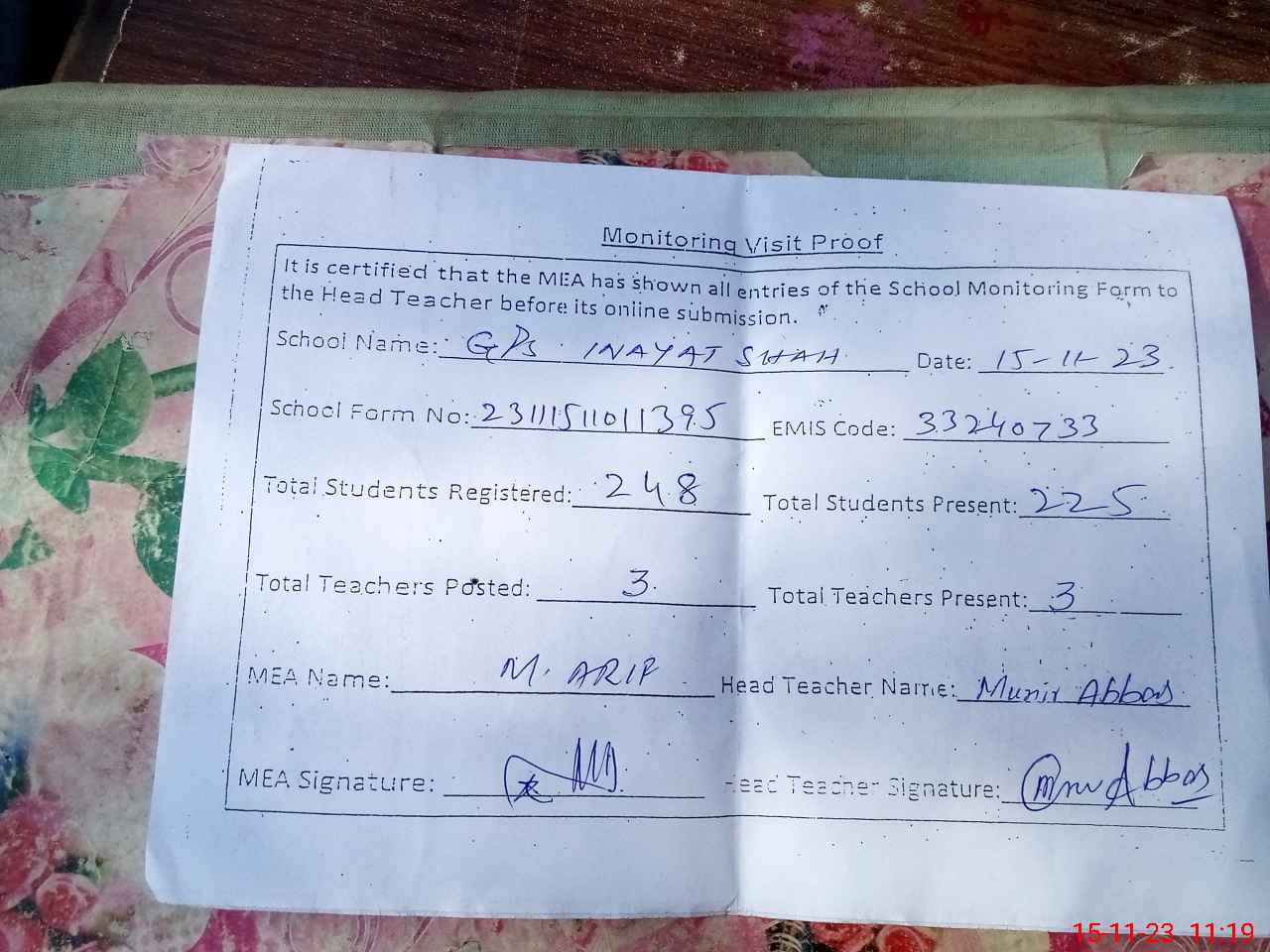 | EMIS Code: 33240733 | Name of School: GPS INAYAT SHAH | |||