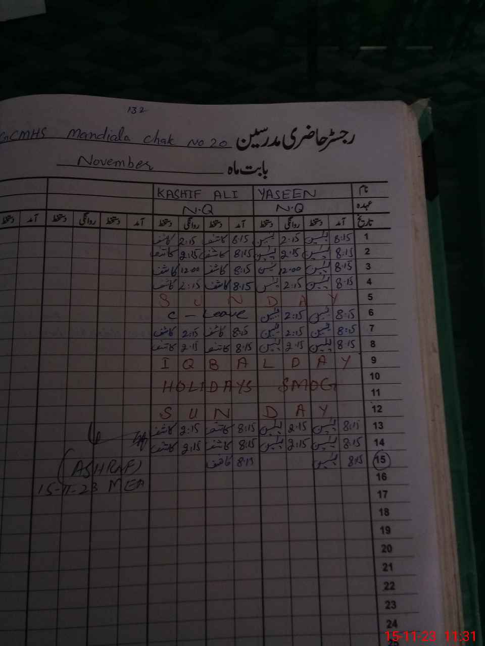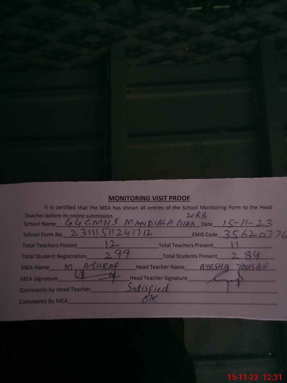 | Attendance Register | Head Teacher | MEA with School | Visit Proof |