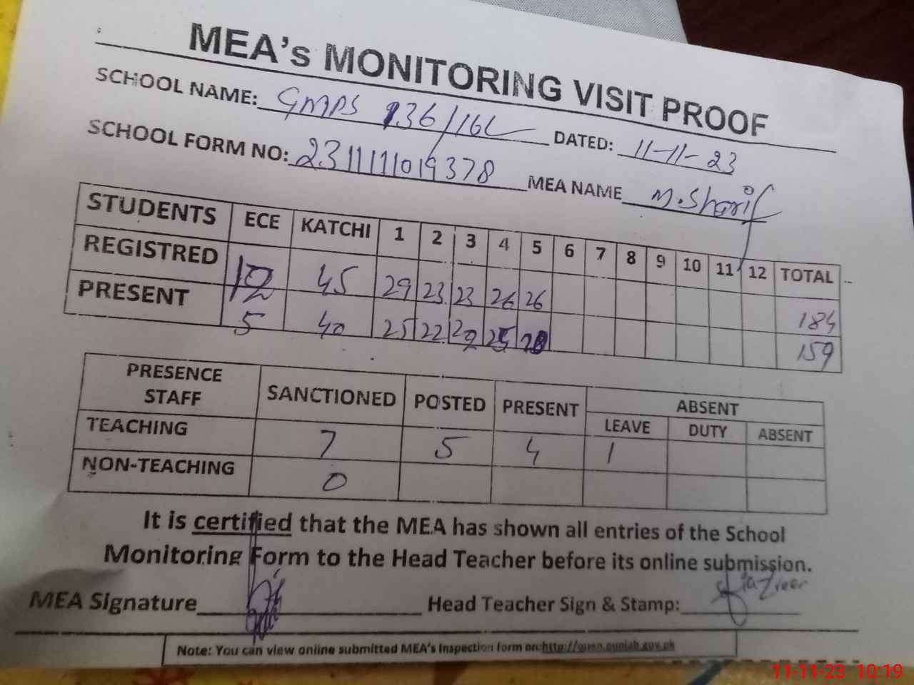 | Attendance Register | Head Teacher | MEA with School | Visit Proof |