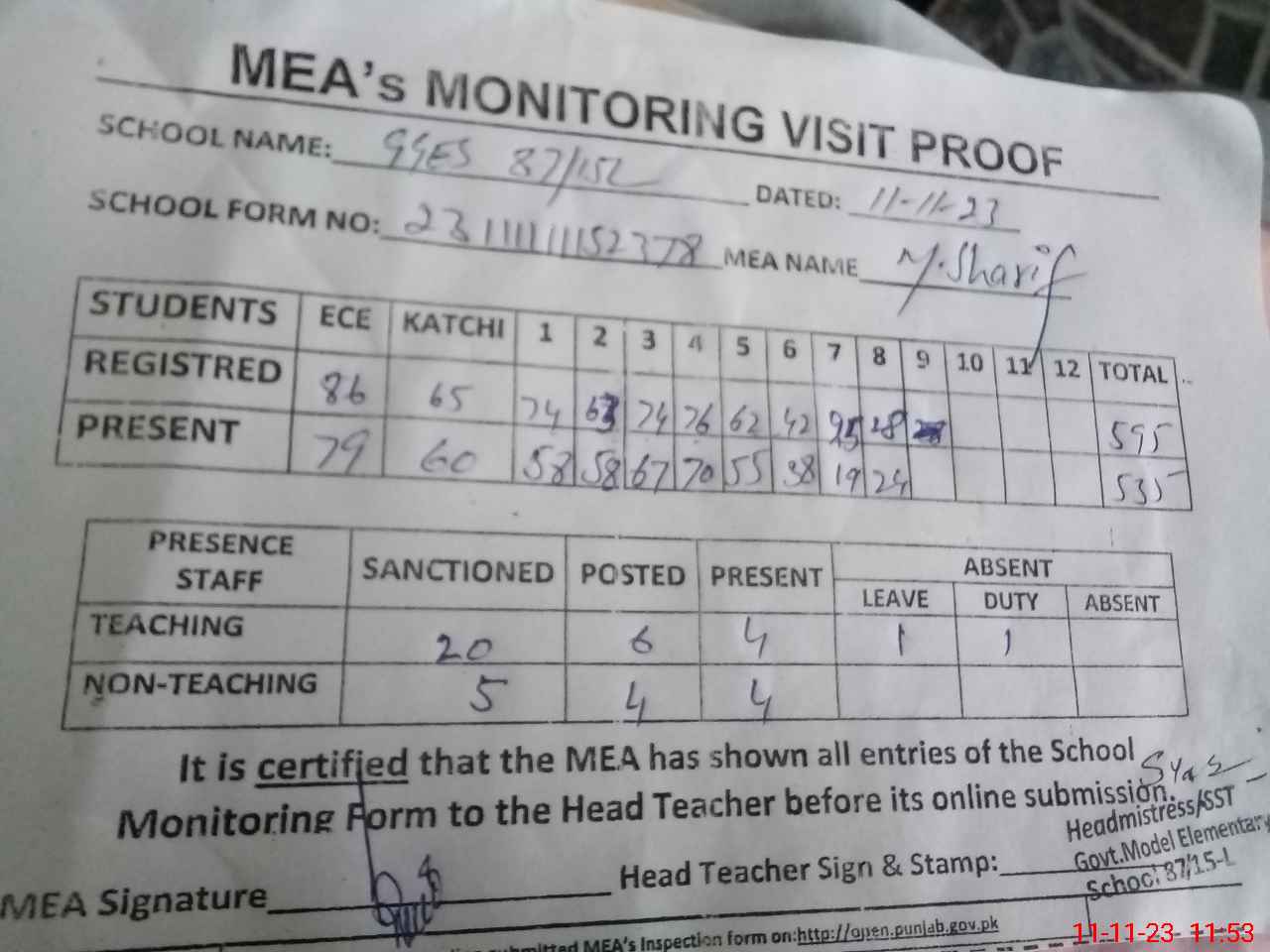 | Attendance Register | Head Teacher | MEA with School | Visit Proof |