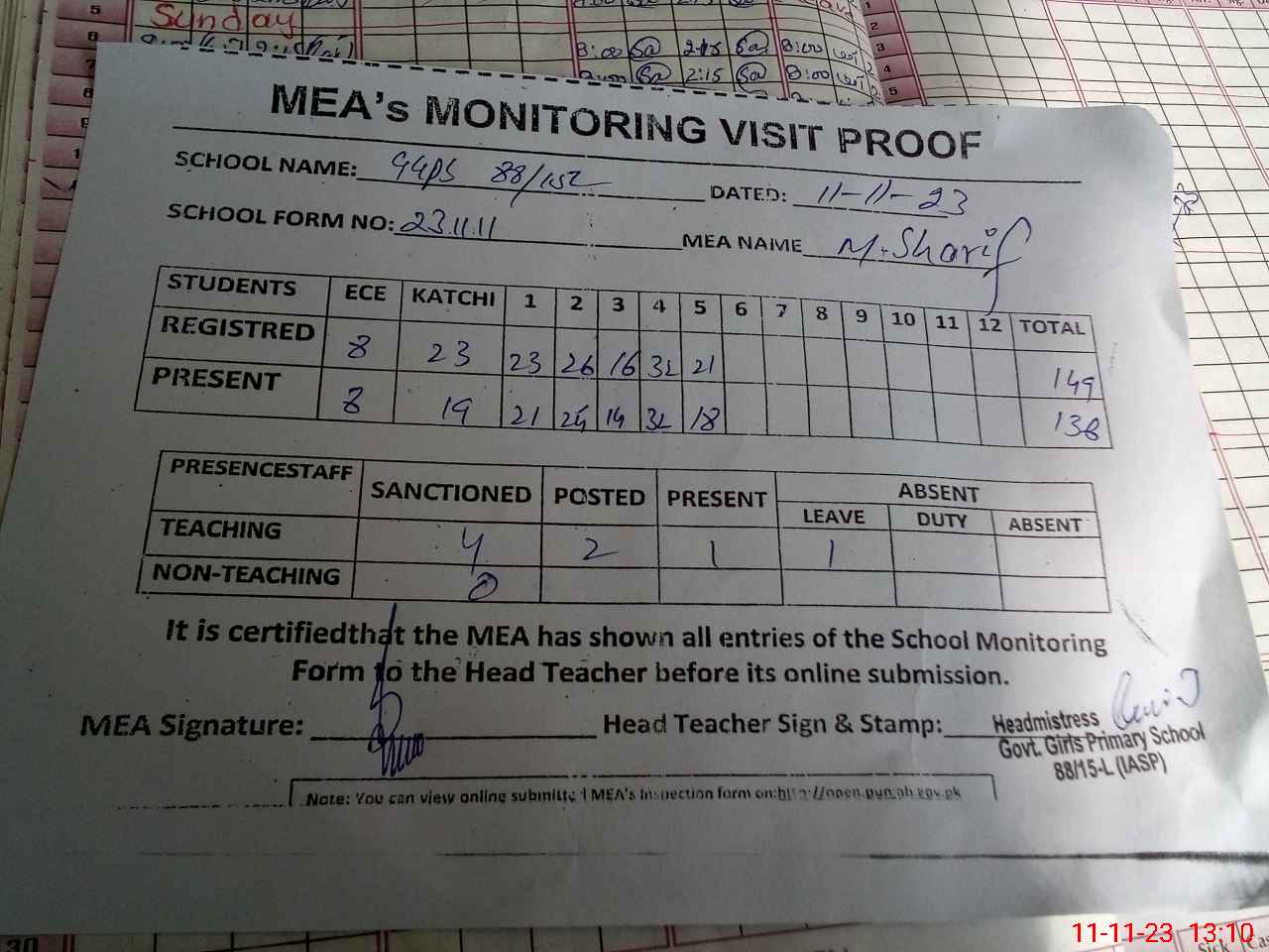 | Attendance Register | Head Teacher | MEA with School | Visit Proof |