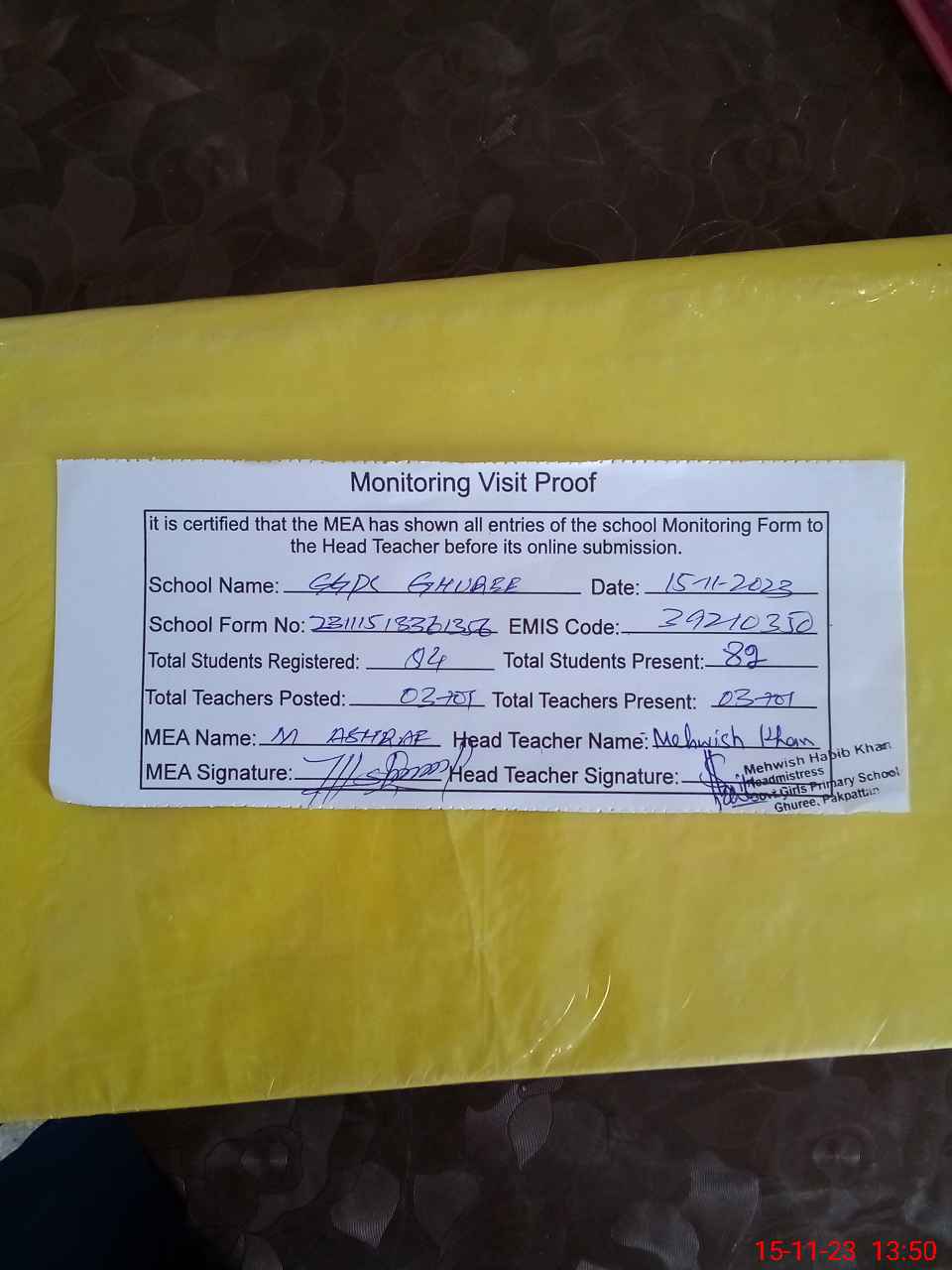 | Attendance Register | Head Teacher | MEA with School | Visit Proof |
