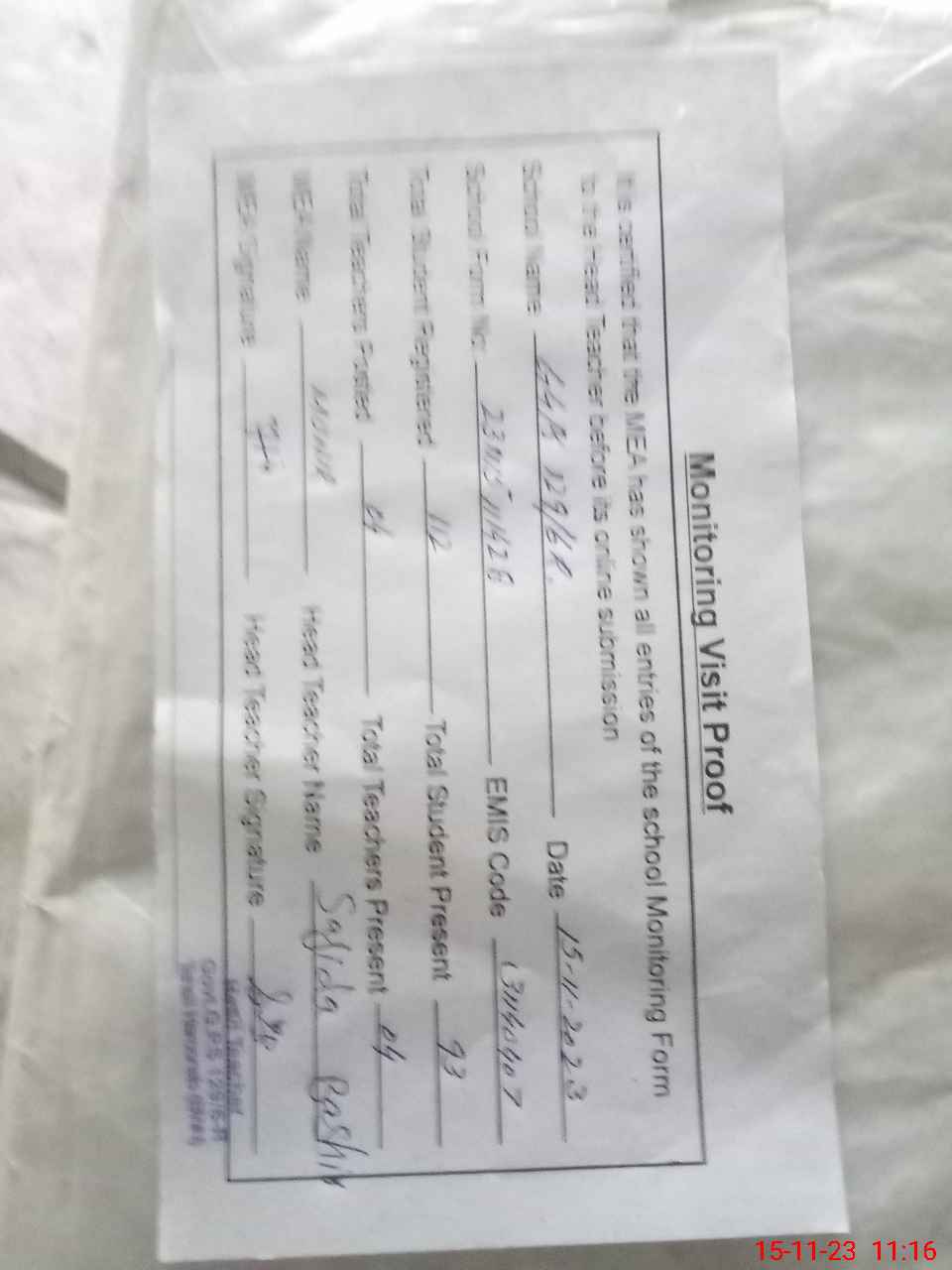 | Attendance Register | Head Teacher | MEA with School | Visit Proof |
