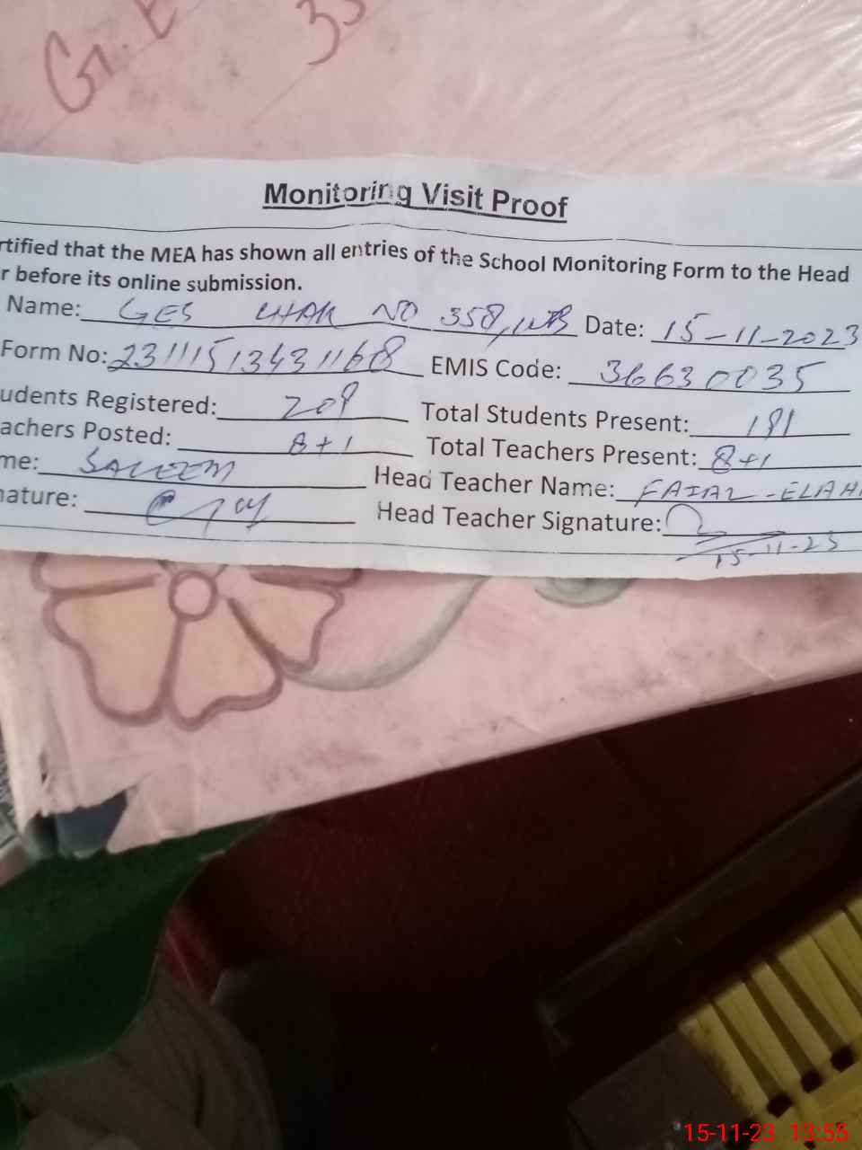| Attendance Register | Head Teacher | MEA with School | Visit Proof |