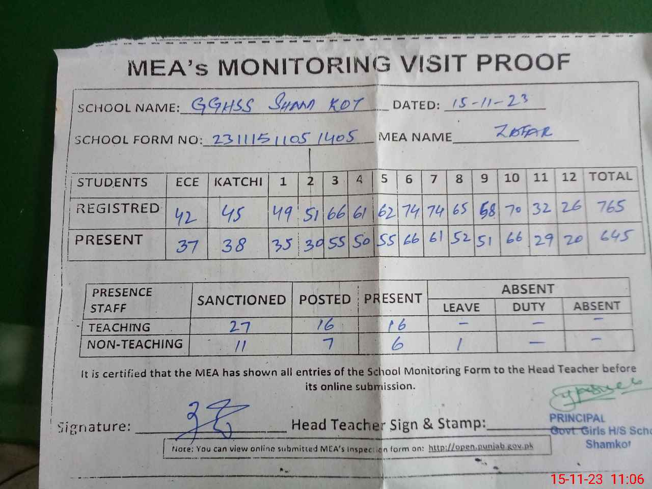 | Attendance Register | Head Teacher | MEA with School | Visit Proof |