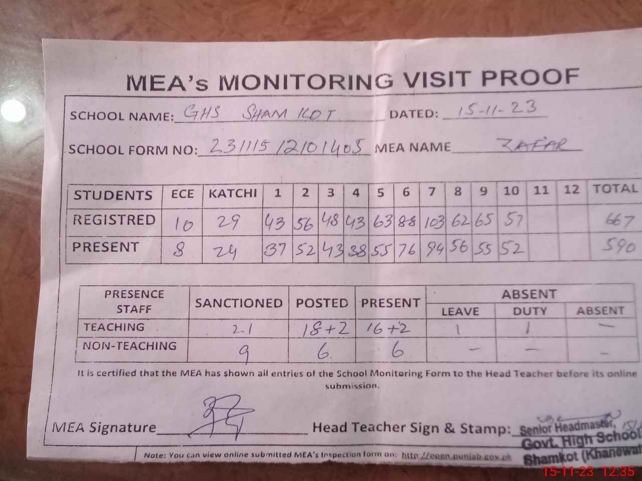 | Attendance Register | Head Teacher | MEA with School | Visit Proof |