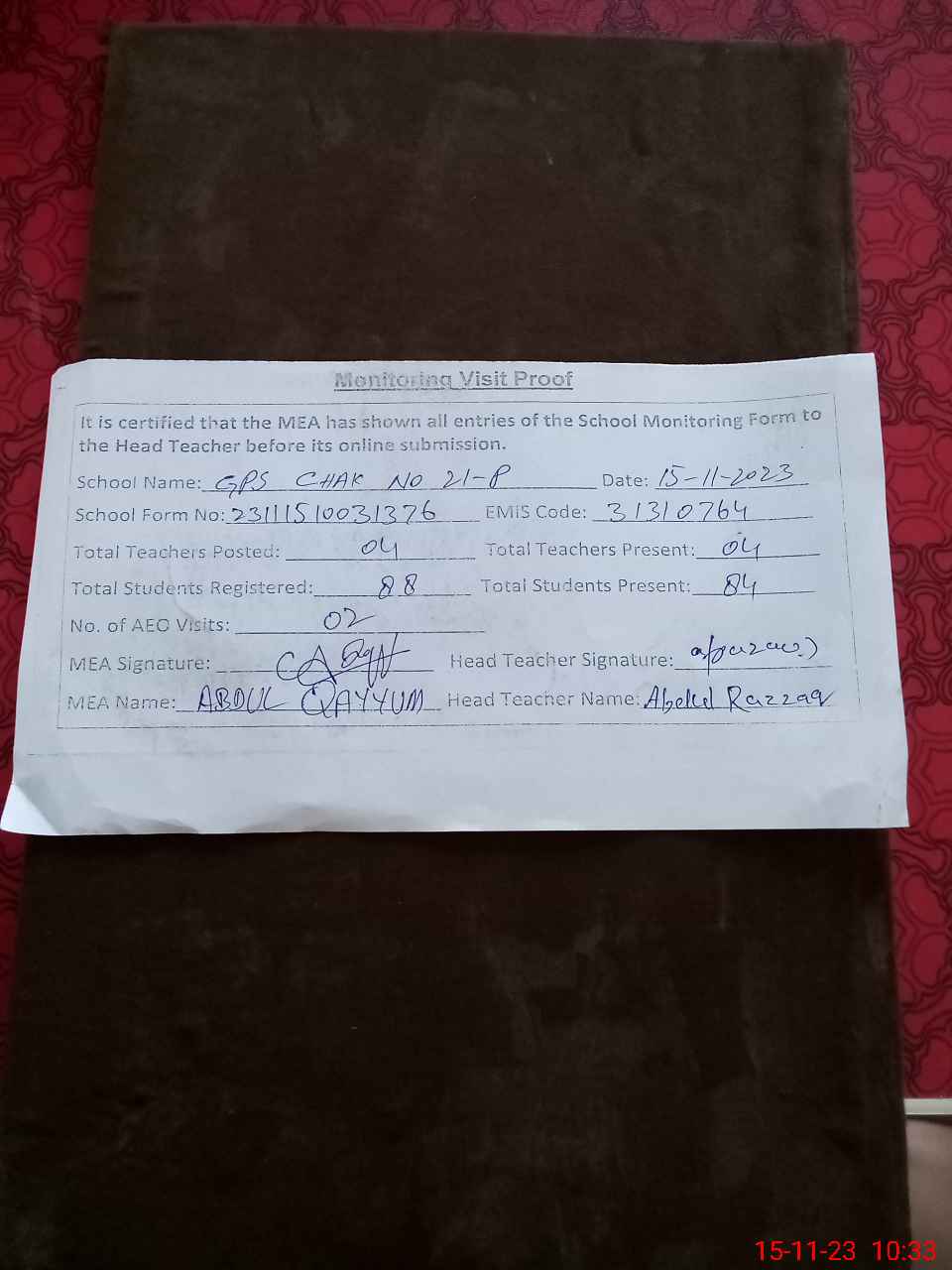 | EMIS Code: 31310764 | Name of School: GPS CHAK NO 21 P | |||