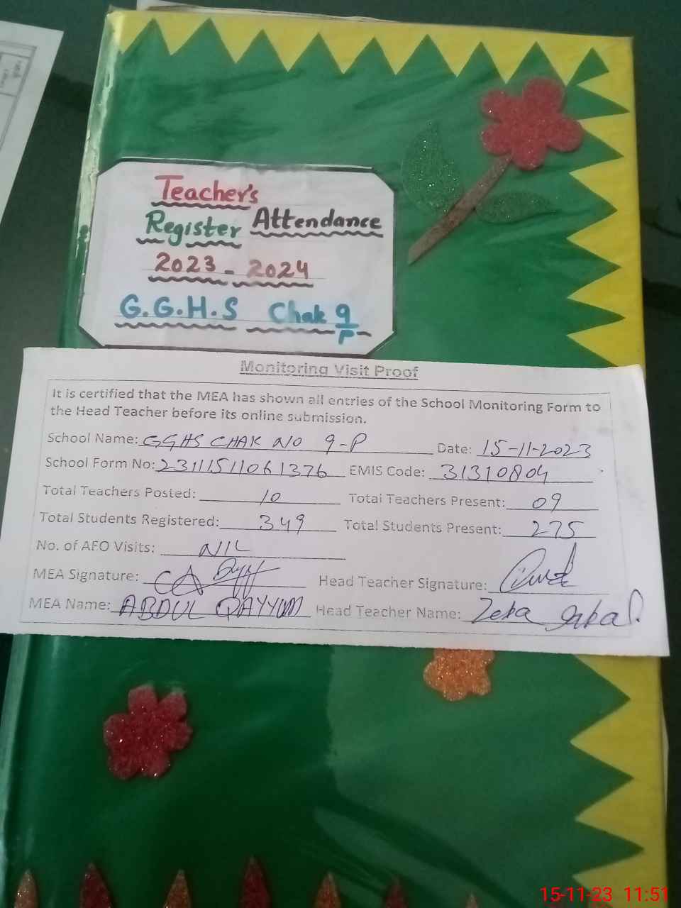 | Attendance Register | Head Teacher | MEA with School | Visit Proof |