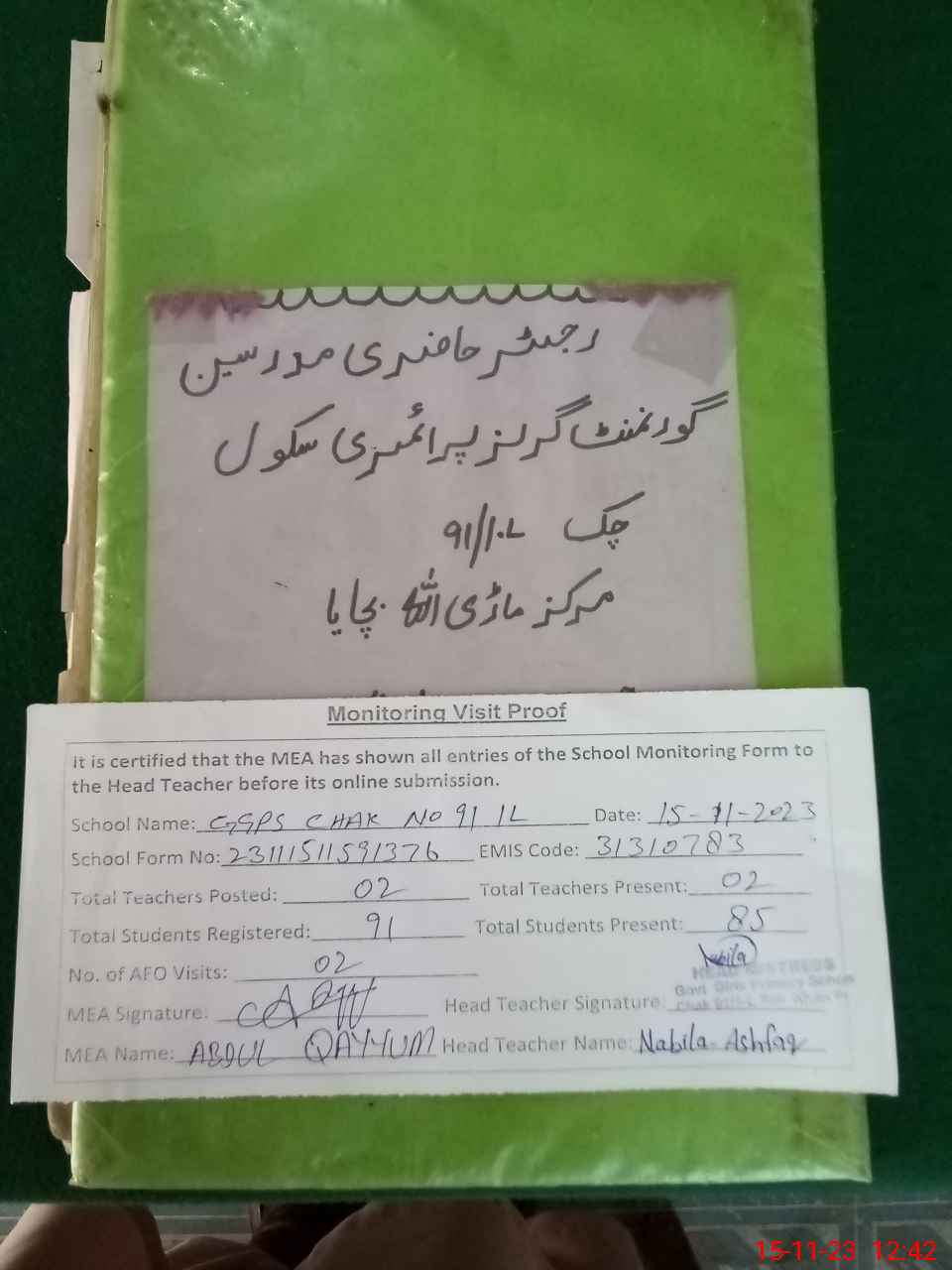 | EMIS Code: 31310783 | Name of School: GGPS CHAK NO 91/1-L | |||