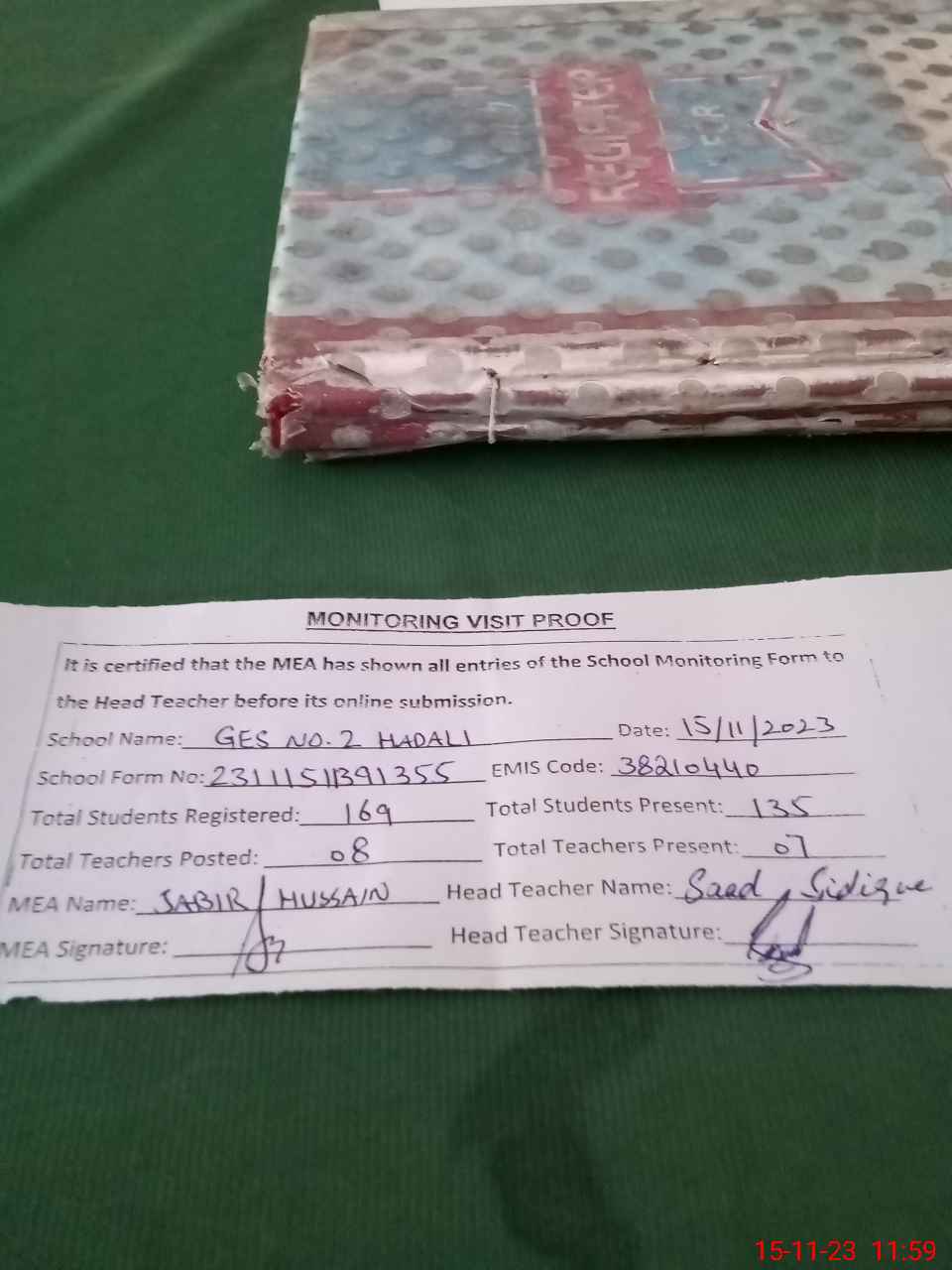 | Attendance Register | Head Teacher | MEA with School | Visit Proof |