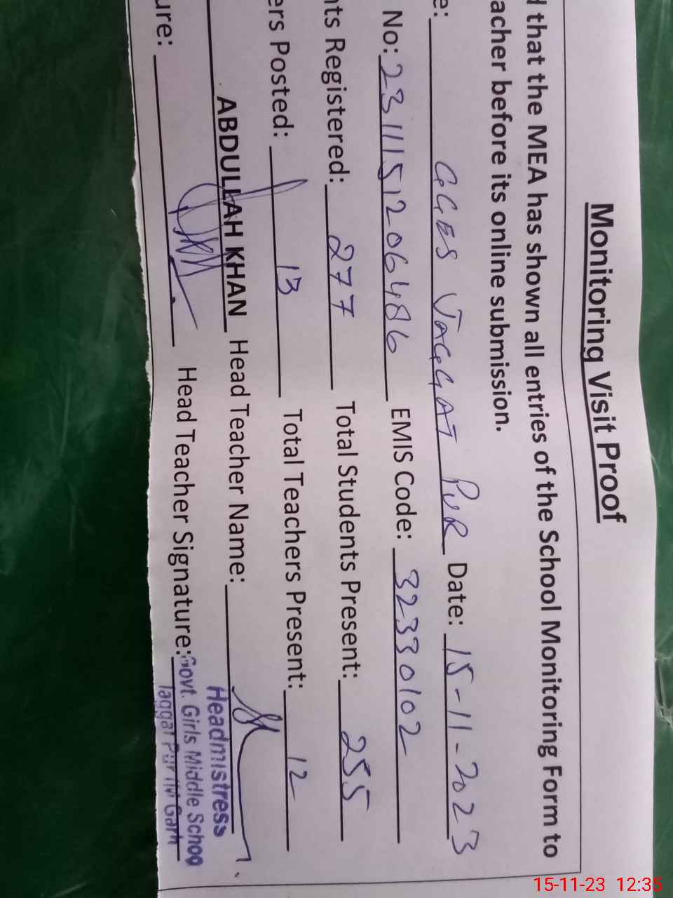 | Attendance Register | Head Teacher | MEA with School | Visit Proof |