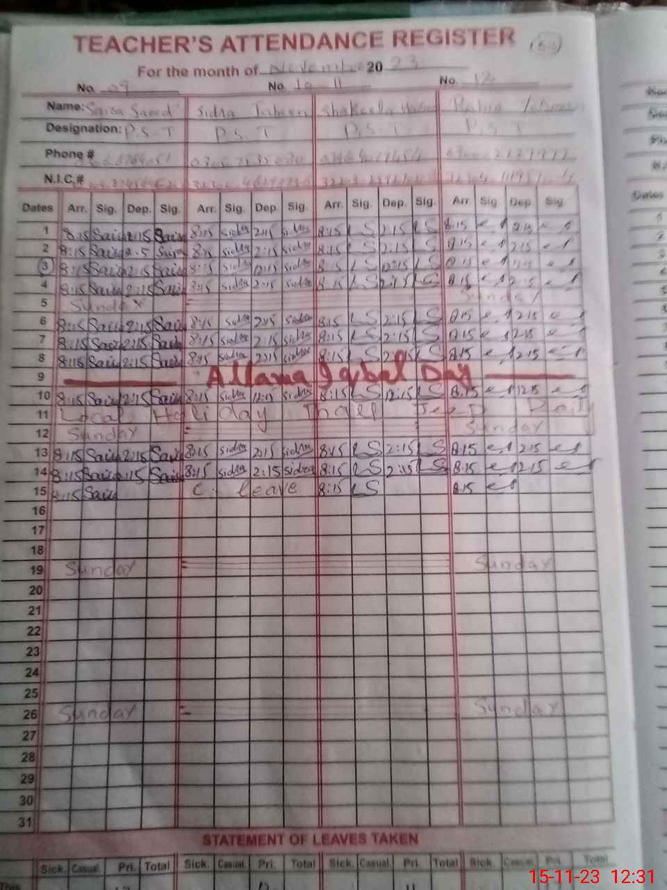 | CNIC | Full Name | Designation | R/C | Absence During Last Calender Month |