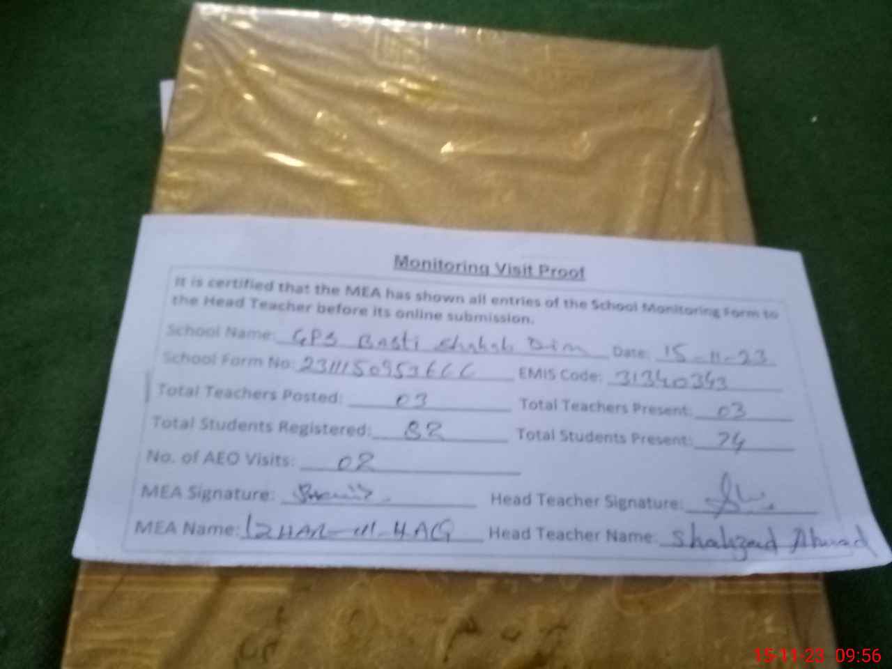 | Attendance Register | Head Teacher | MEA with School | Visit Proof |