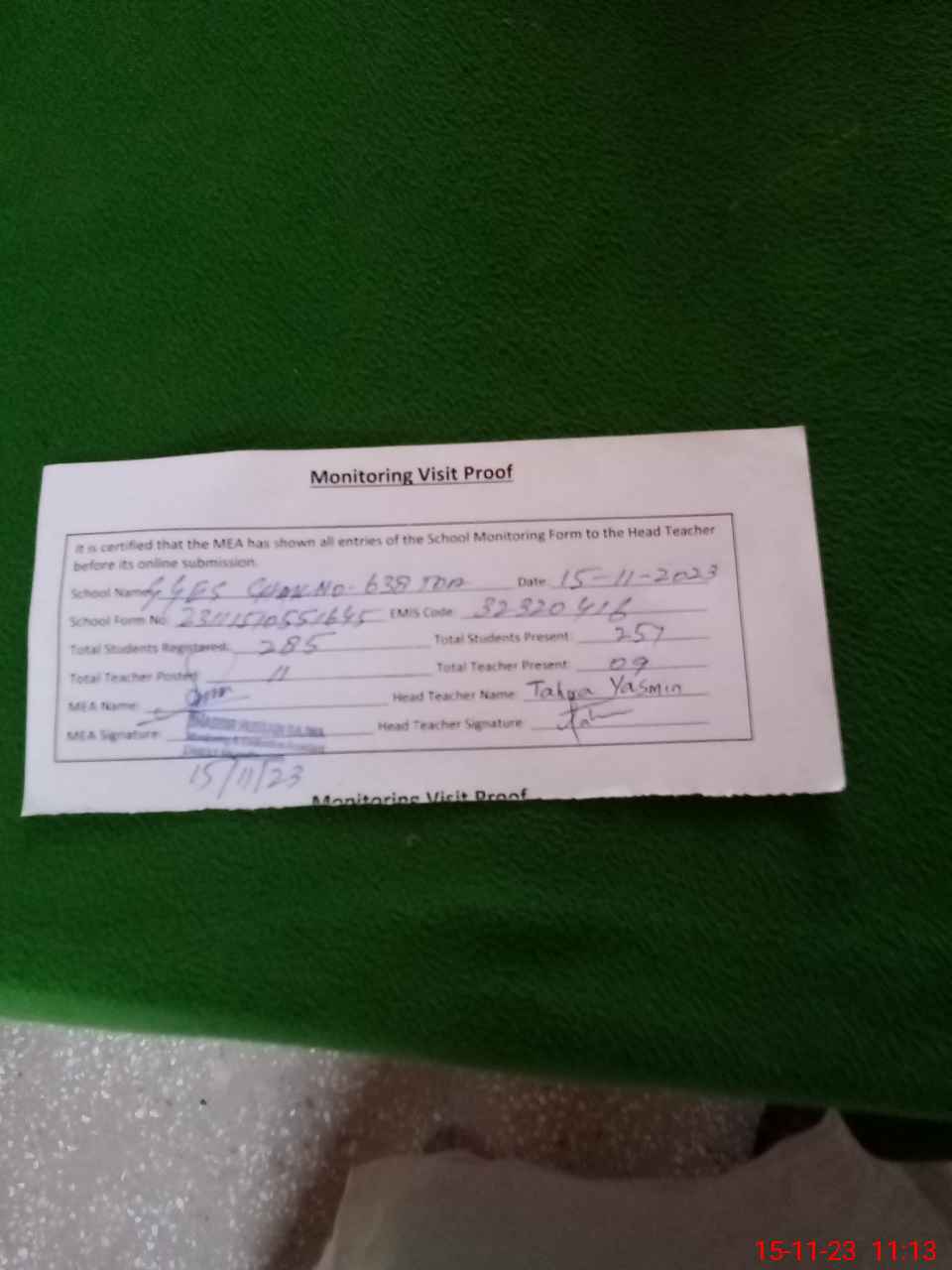 | Attendance Register | Head Teacher | MEA with School | Visit Proof |