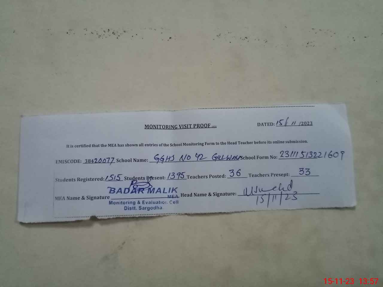 | EMIS Code: 38420077 | Name of School: GGHS CHAK NO.42 NB GILL WALA | |||