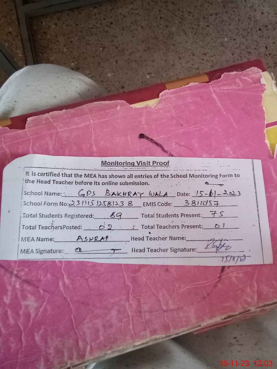 | EMIS Code: 38110157 | Name of School: GPS BAKHRRAY WALA | |||