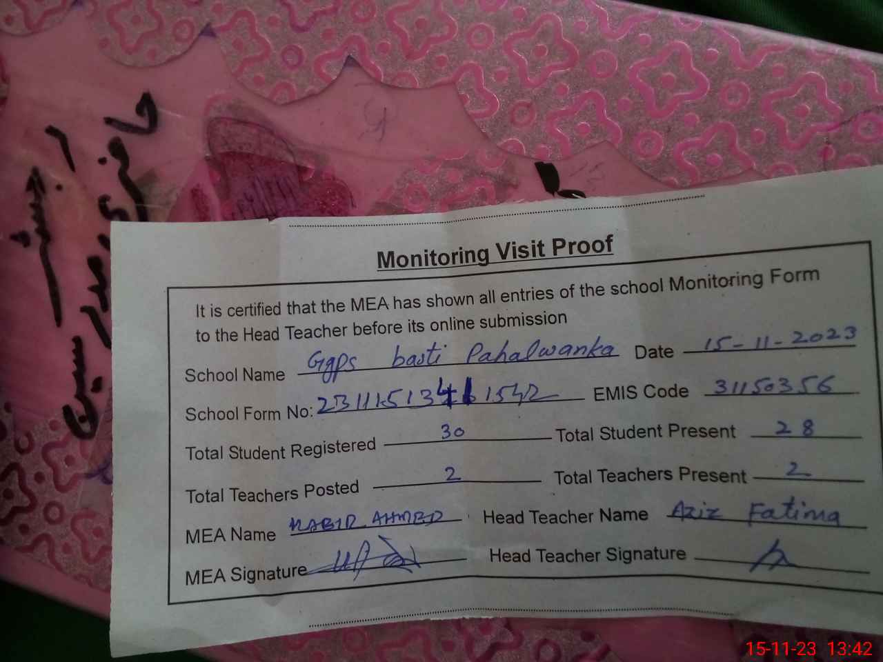 | Attendance Register | Head Teacher | MEA with School | Visit Proof |