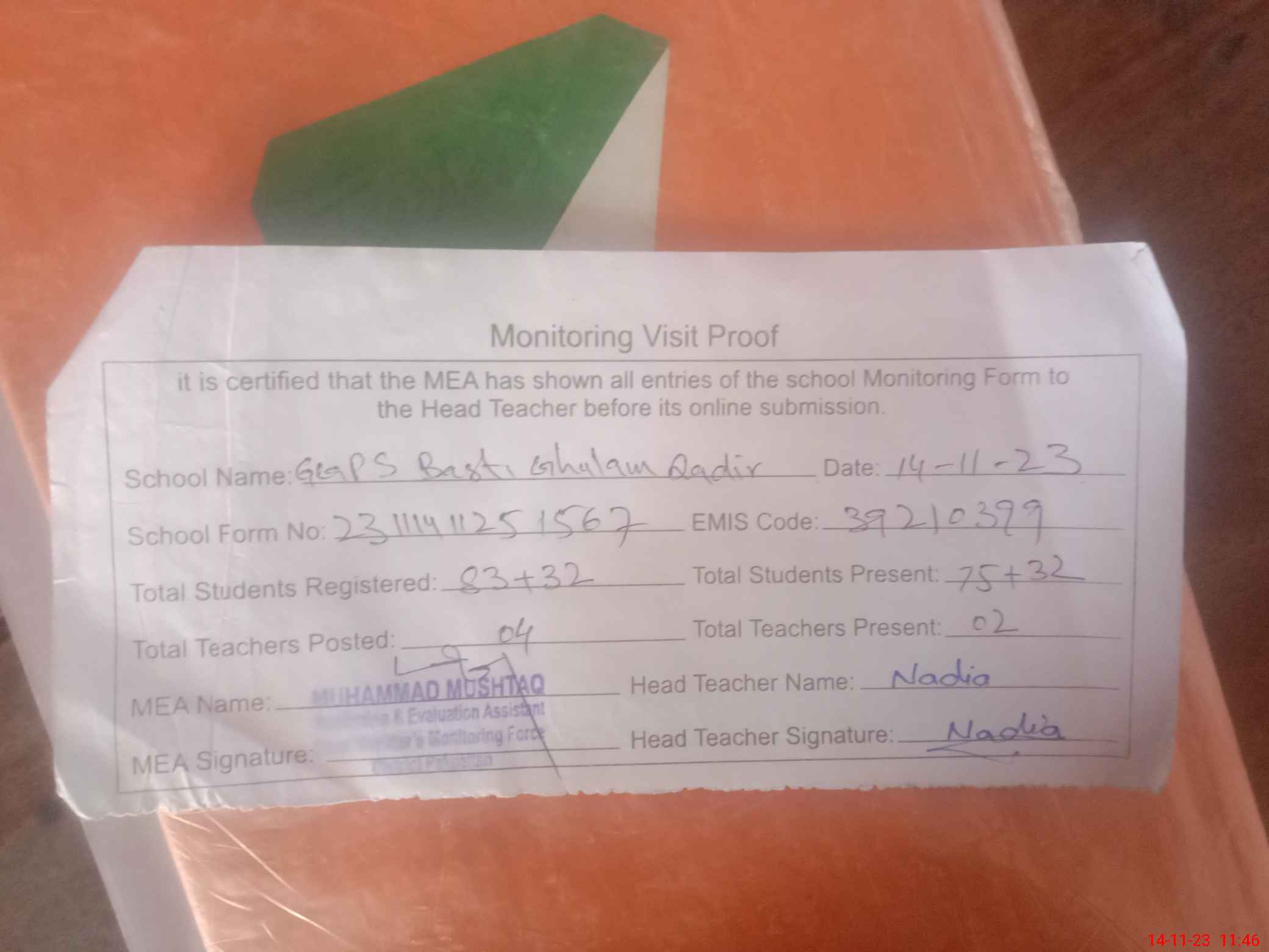 | Attendance Register | Head Teacher | MEA with School | Visit Proof |