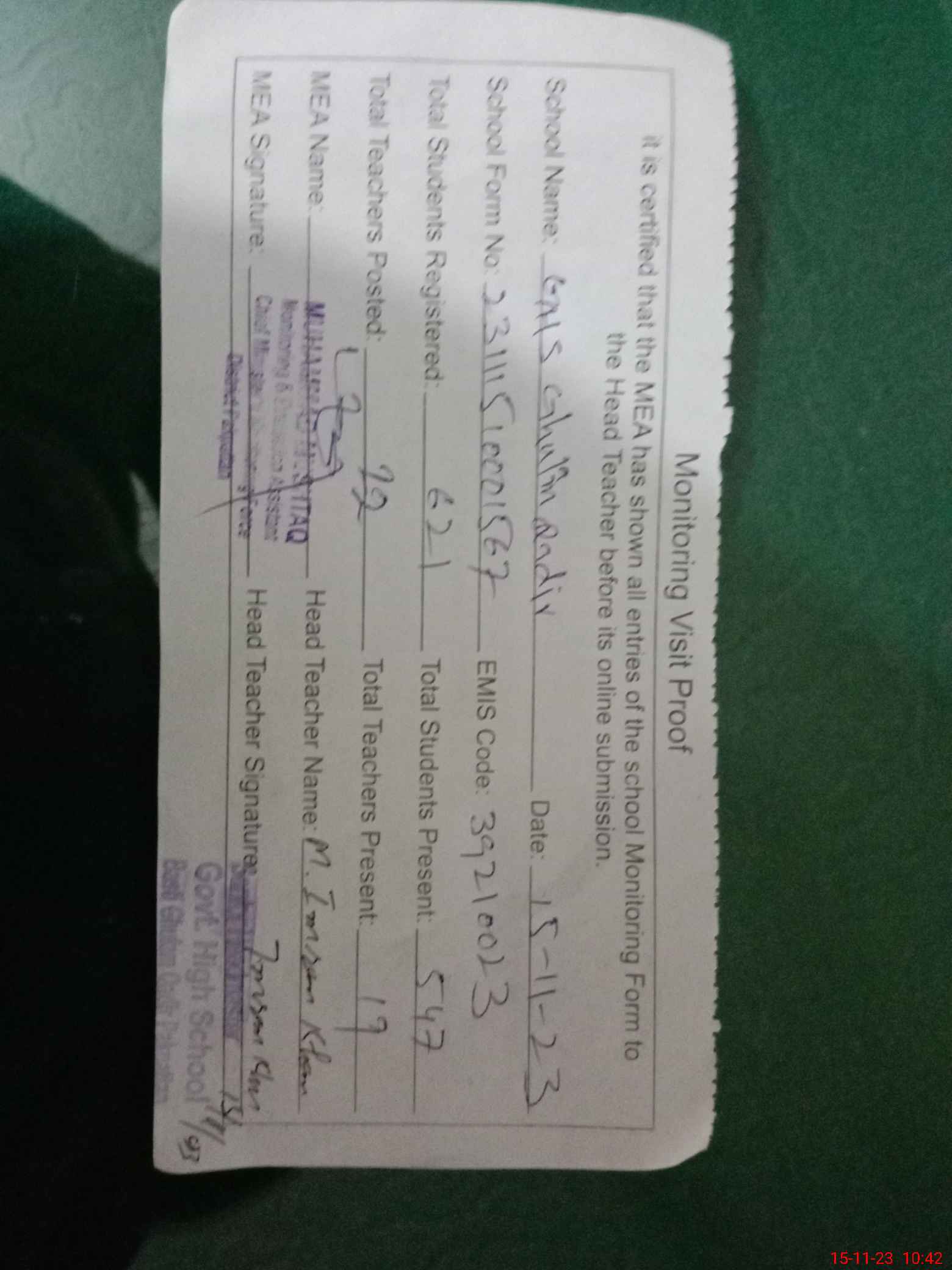 | Attendance Register | Head Teacher | MEA with School | Visit Proof |