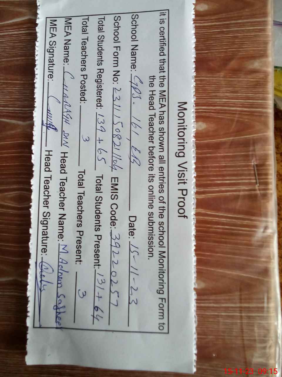 | Attendance Register | Head Teacher | MEA with School | Visit Proof |