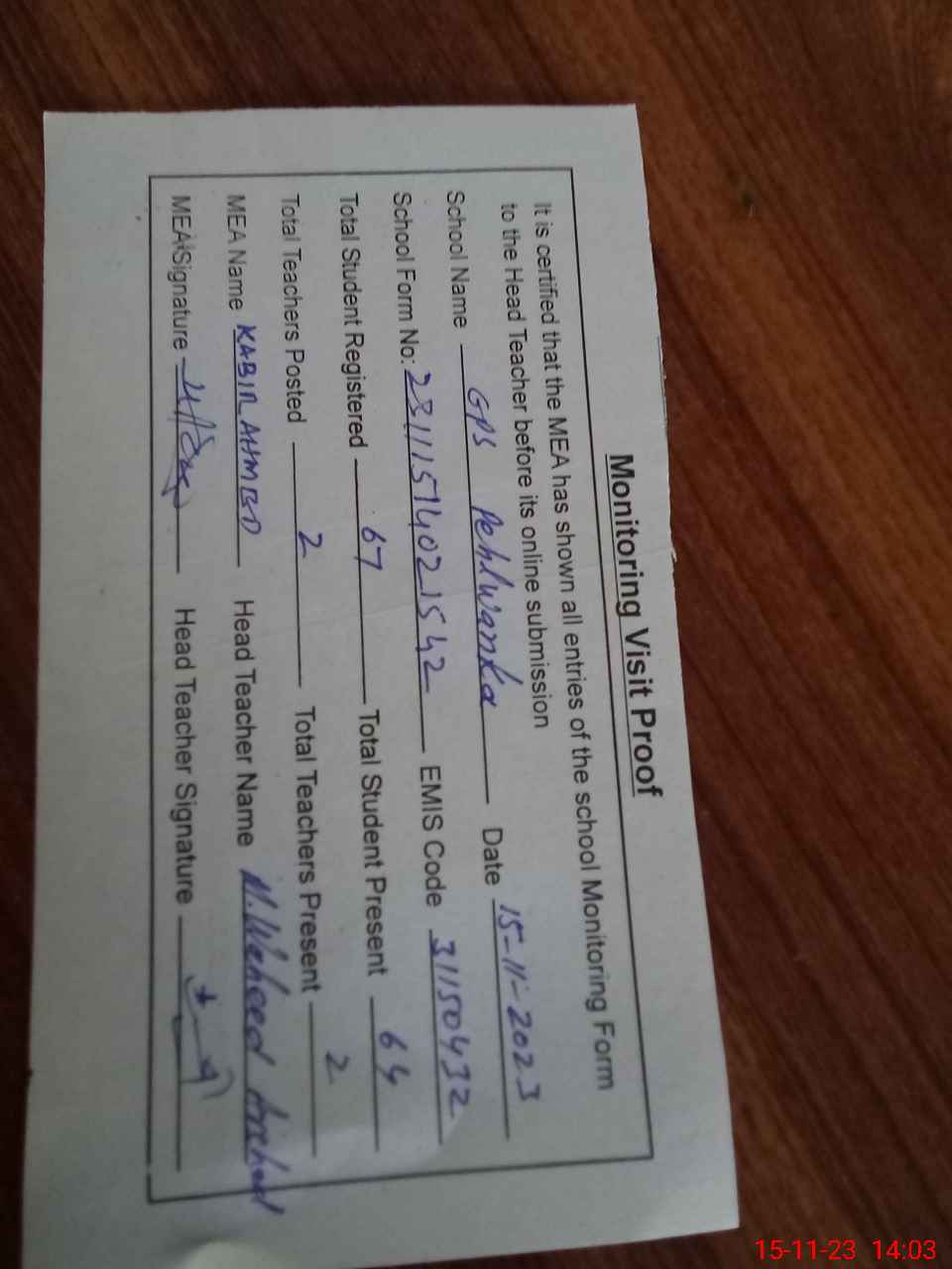 | Attendance Register | Head Teacher | MEA with School | Visit Proof |