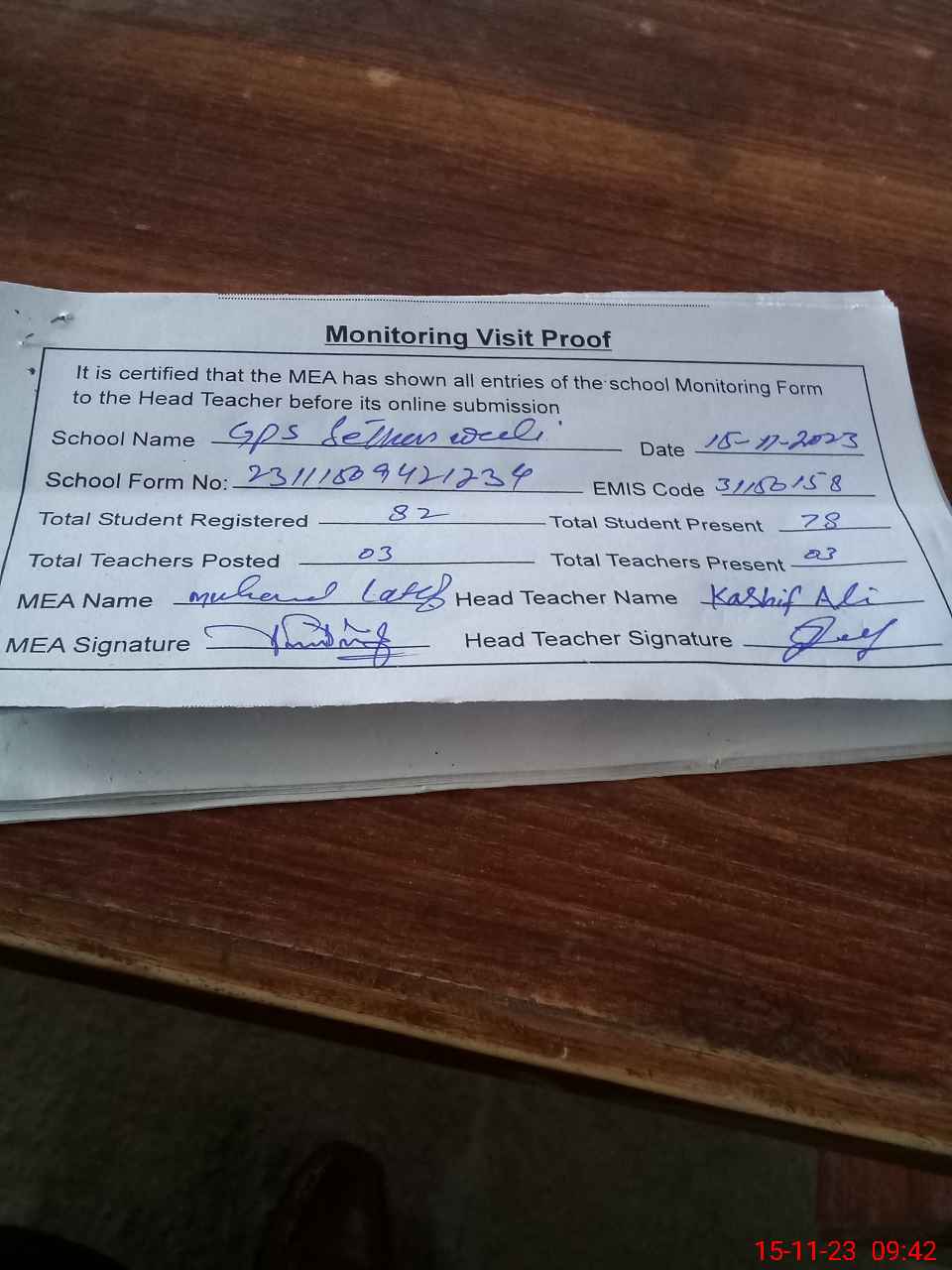 | EMIS Code: 31150158 | Name of School: GPS SETHANA WALI | |||