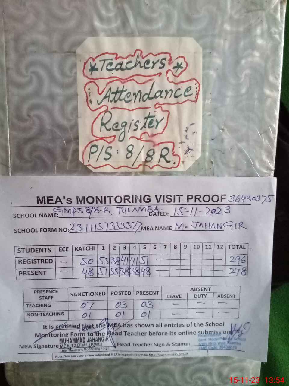| Attendance Register | Head Teacher | MEA with School | Visit Proof |