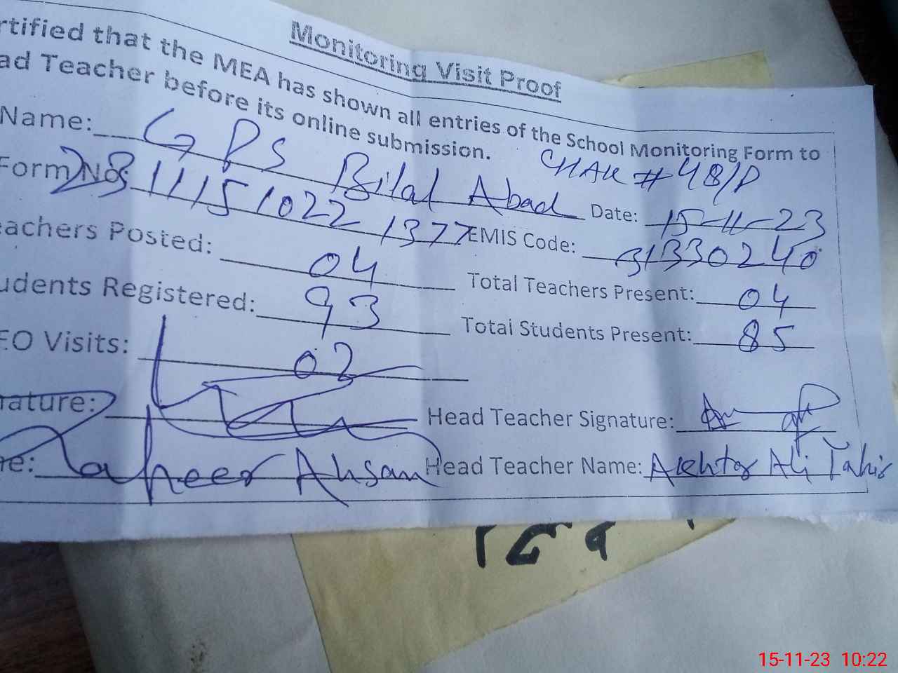 | Monitoring Date: 15-11-2023 | Start Time: 15-11-2023 09:51 AM | End Time: 15-11-2023 10:26 AM | Name of MEA: Za**** Ah**** | |