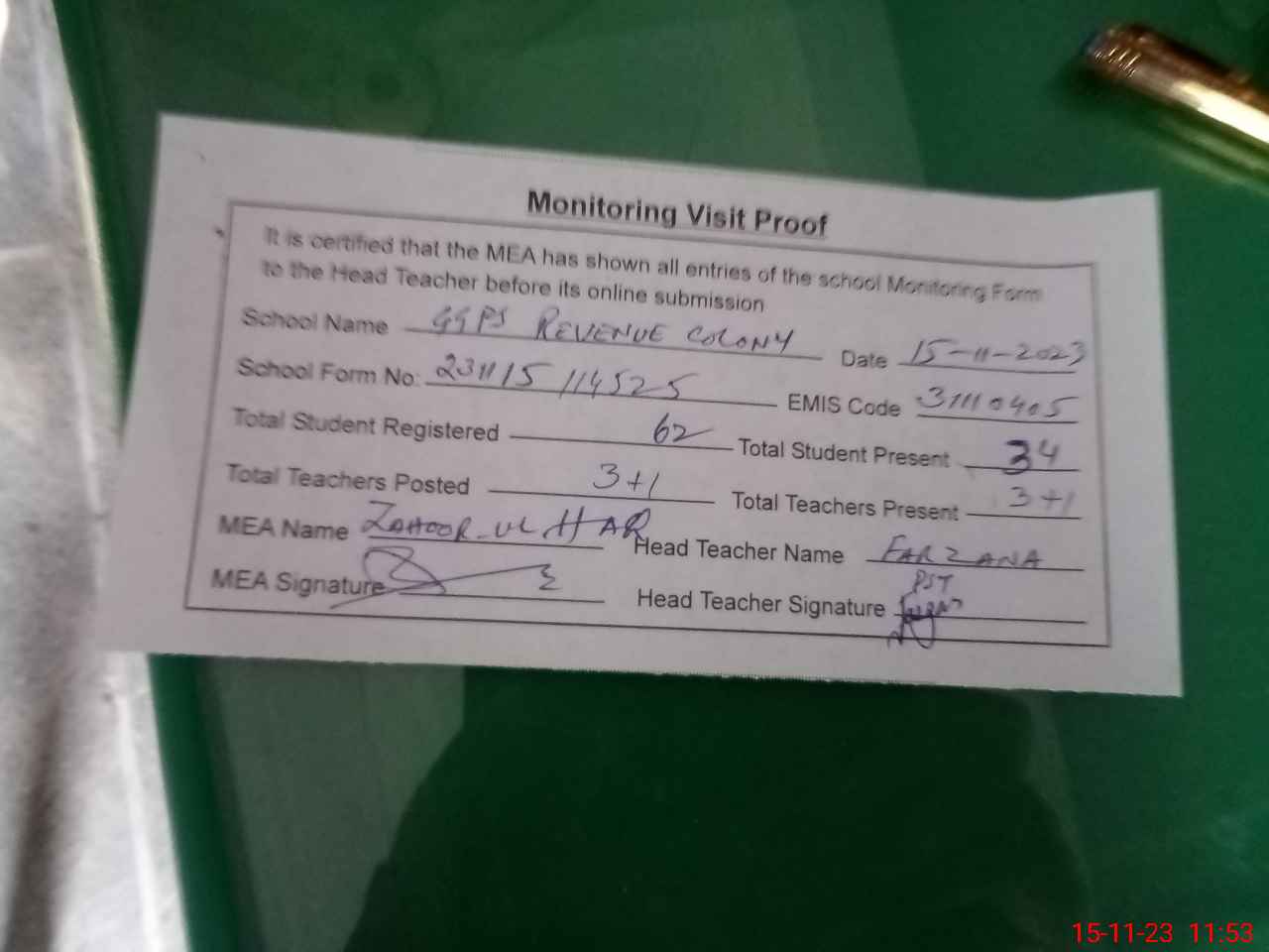 | Attendance Register | Head Teacher | MEA with School | Visit Proof |