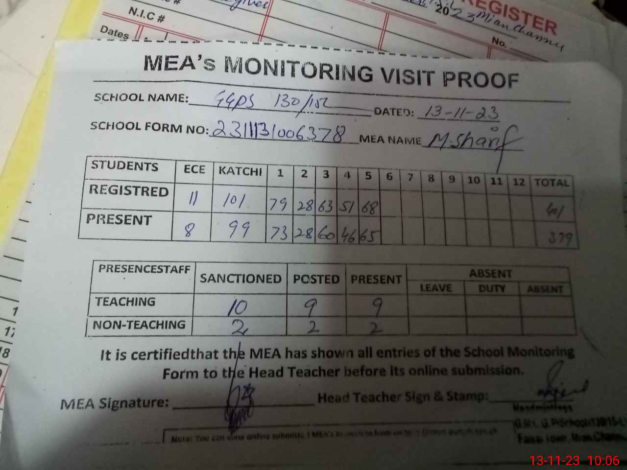 | Attendance Register | Head Teacher | MEA with School | Visit Proof |