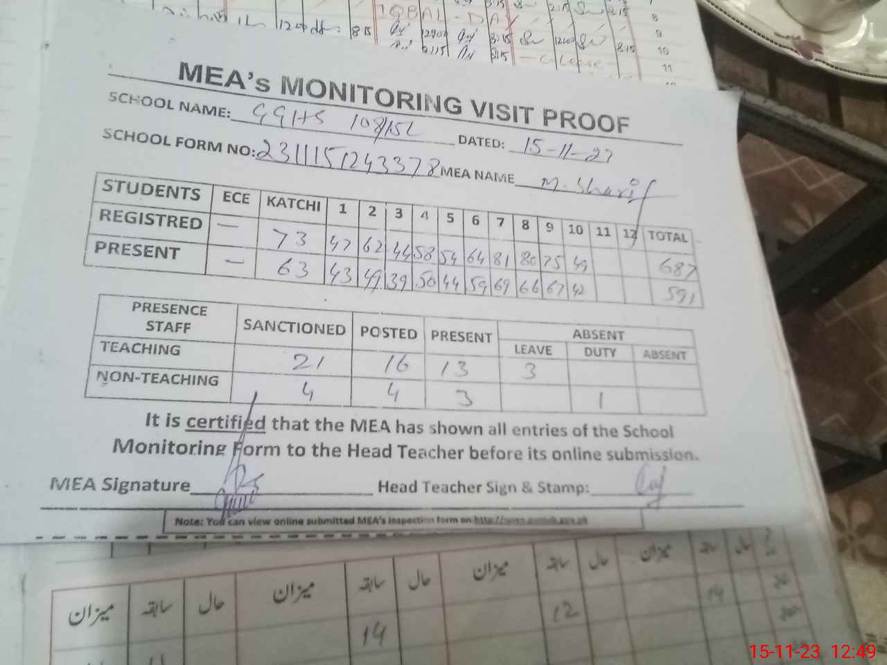 | Attendance Register | Head Teacher | MEA with School | Visit Proof |