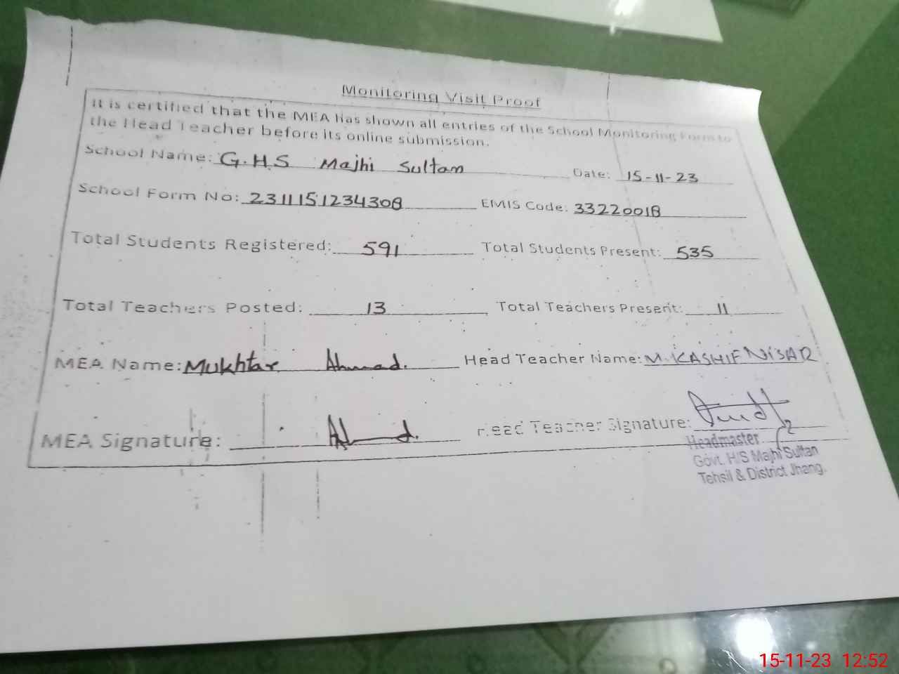 | EMIS Code: 33220018 | Name of School: GHS MAJHI SULTAN | |||