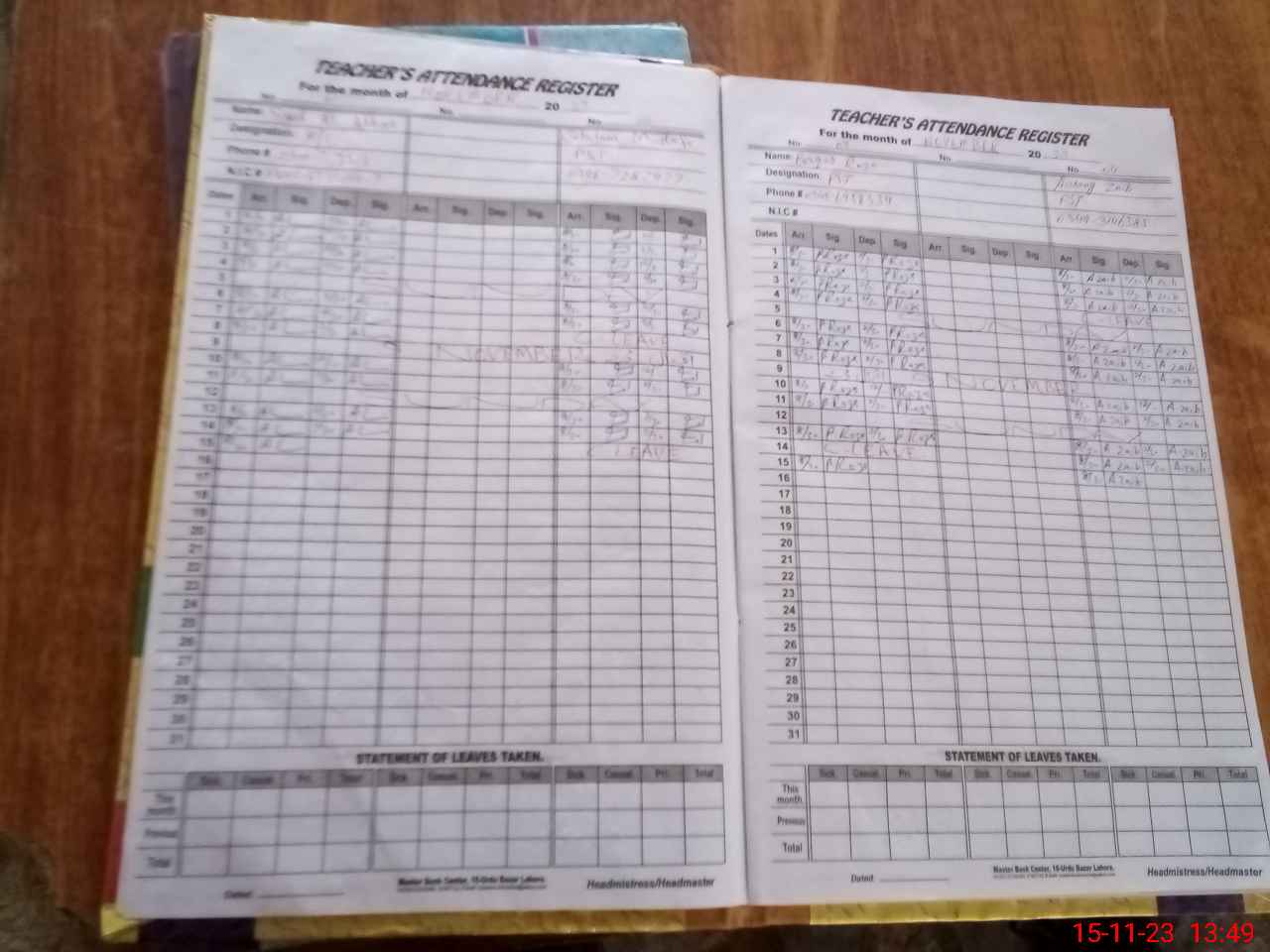 | CNIC | Full Name | Designation | R/C | Absence During Last Calender Month |
